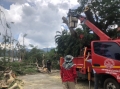 รองนายกสมชาย ดวงติ๊บ พร้อมด้วยทีมงานป้องกันฯ ตัดต้นไม้ล้มขวางถนน บริเวณบ้านเมืองสอง