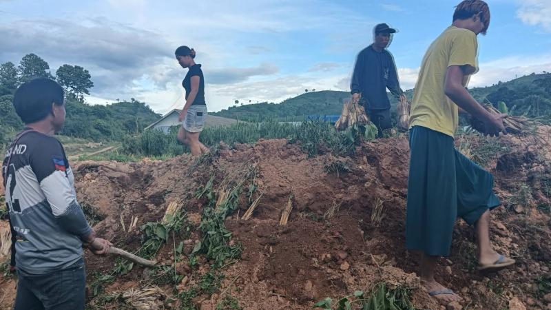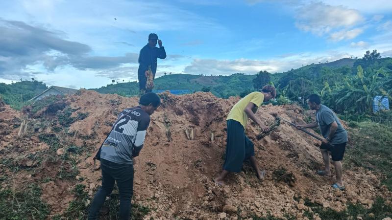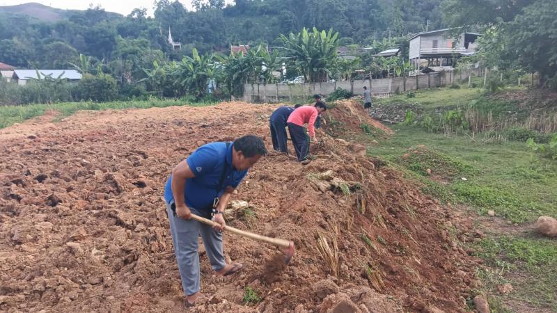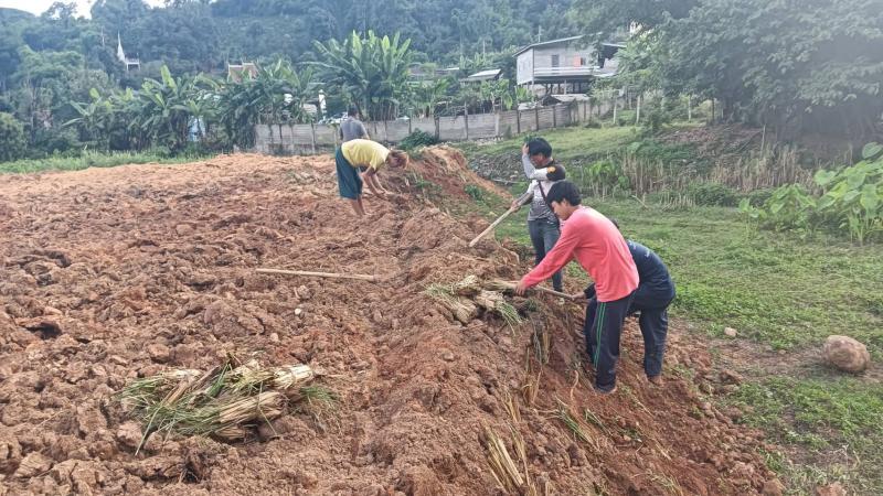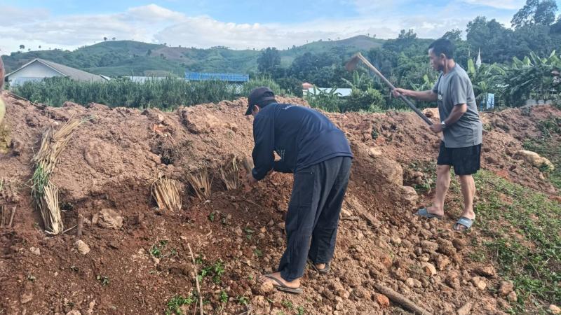 อาสาสมัครท้องถิ่นรักษ์โลก ร่วมกันปลูกหญ้าแฝกที่บริเวณหอประชุมบ้านนาโต่