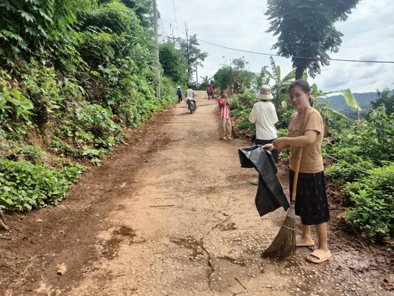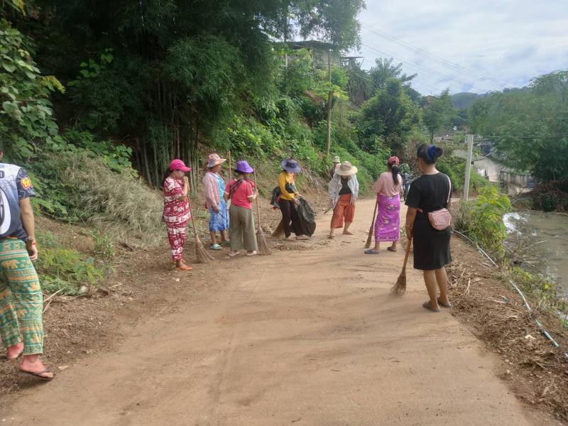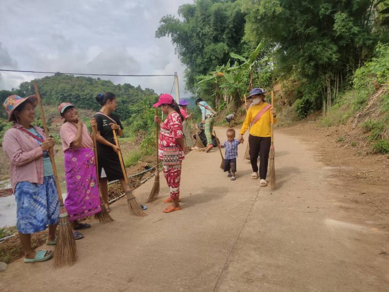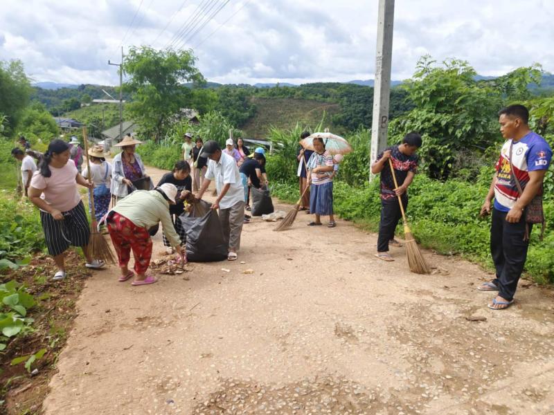 อาสาสมัครท้องถิ่นรักษ์โลก ร่วมกันทำความสะอาดเก็บขยะทำลายแหล่งเพราะพันธ์ลูกน้ำยุงลาย ภายในหมู่บ้าน บ้านหินคำ