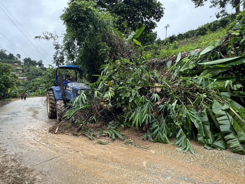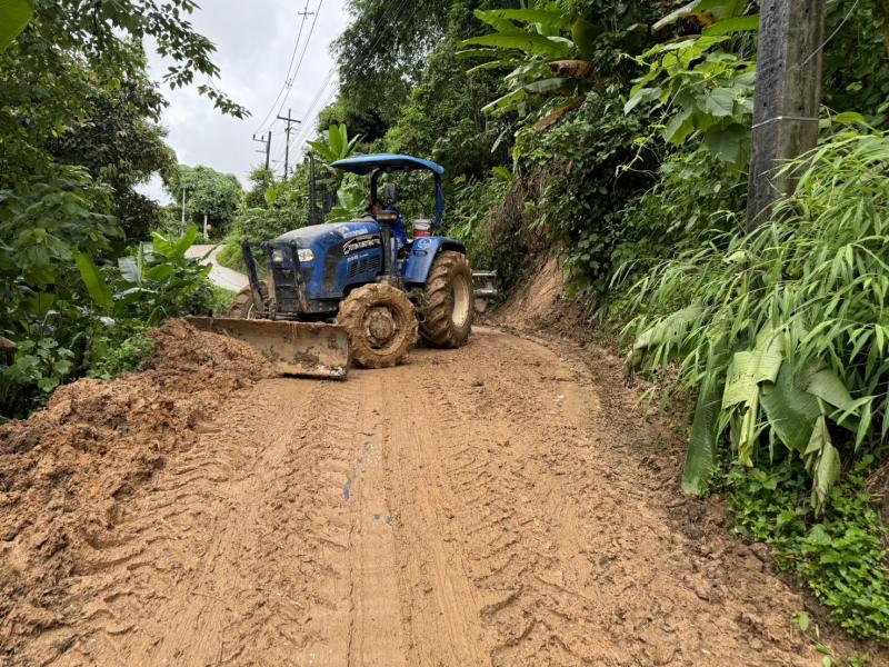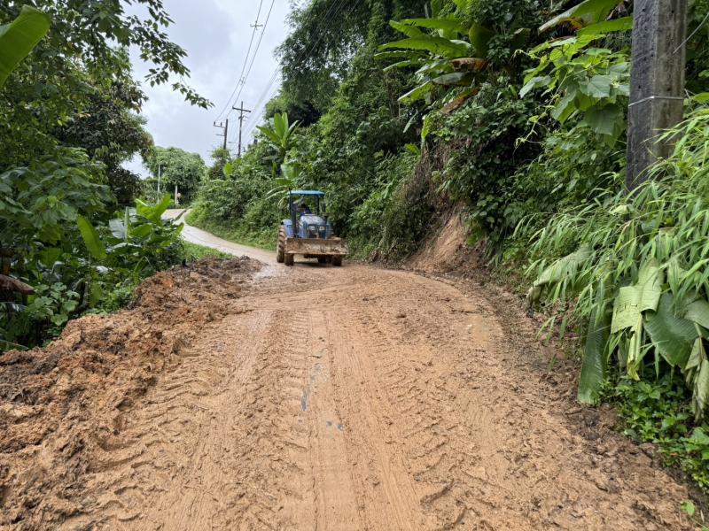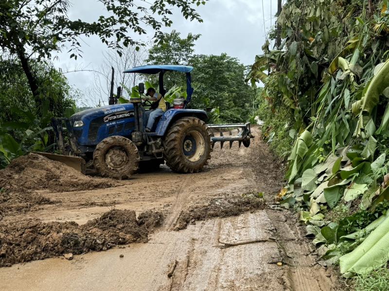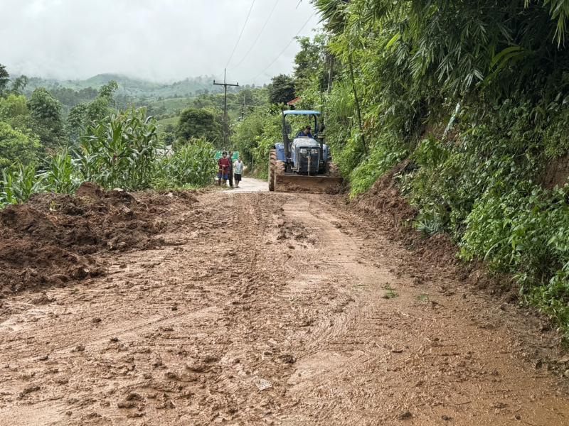 งานป้องกันฯ นำรถไถลงพื้นที่ปรับดินสไลด์ปิดทับถนน บริเวณบ้านห้วยหยวกป่าโซและบ้านเล่าลิ่ว จำนวน 3 จุด