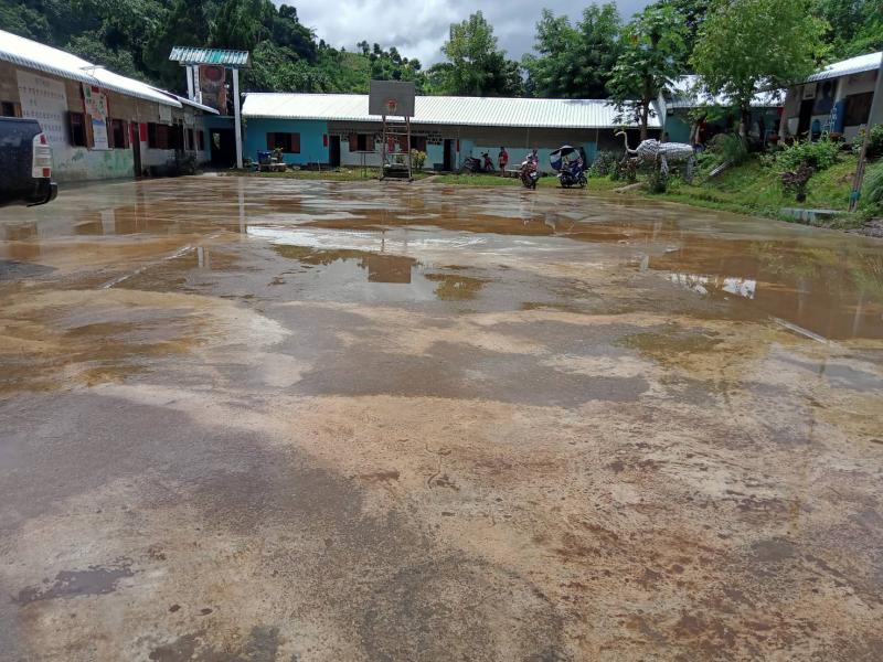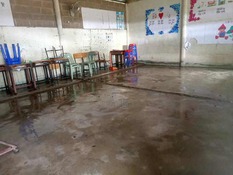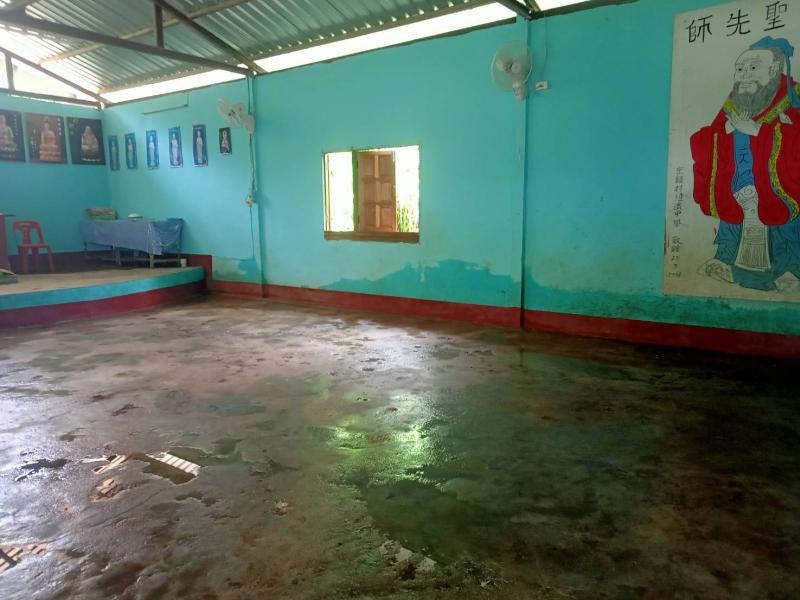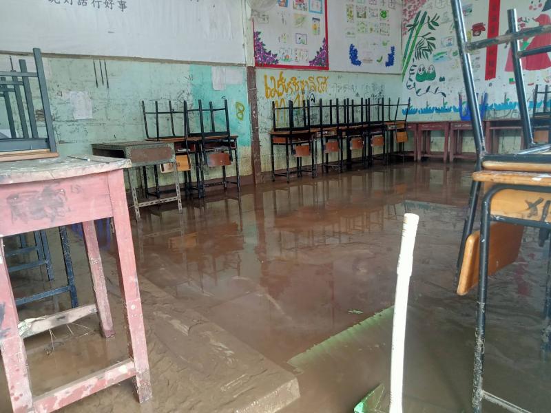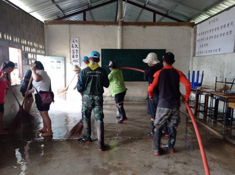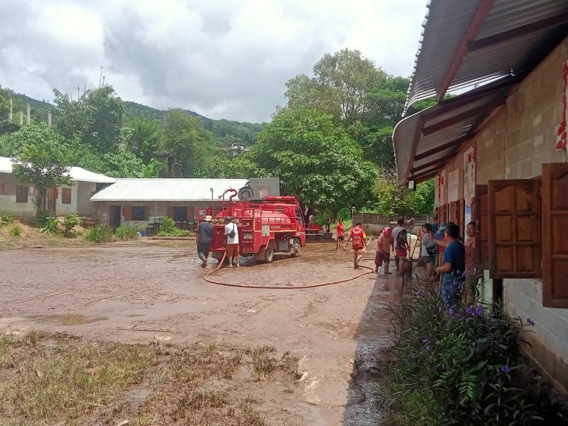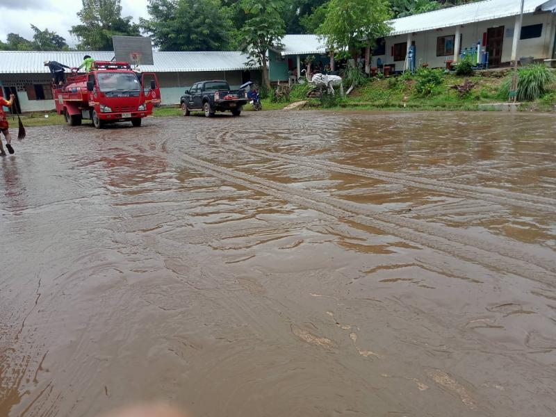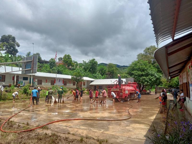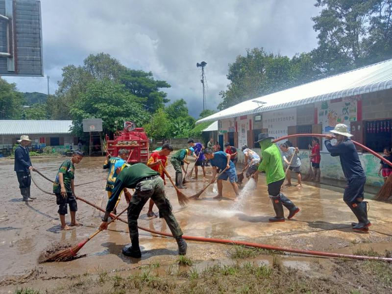 ทีมงานป้องกันฯ นำรถบรรทุกน้ำออกทำความสะอาดล้างดินโคลน จากเหตุอุทกภัย โรงเรียนจีนบ้านเล่าลิ่ว