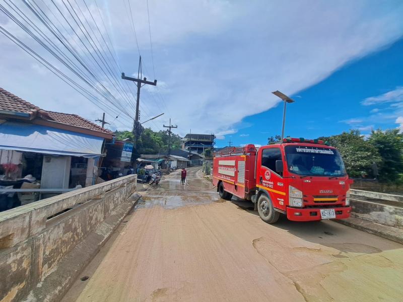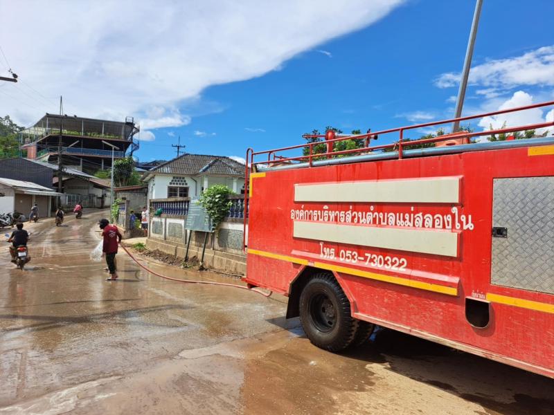 วันนี้ 29 กันยายน 2567 งานป้องกันและบรรเทาสาธารณภัย อบต.แม่สลองใน นำรถบรรทุกน้ำ ลงพื้นที่ล้างทำความสะอาดพื้นที่ได้รับความเสียหาย จากเหตุการณ์น้ำท่วม บริเวณตลาดไททอง (ม.12) และถนน