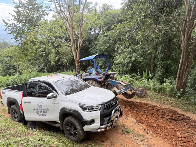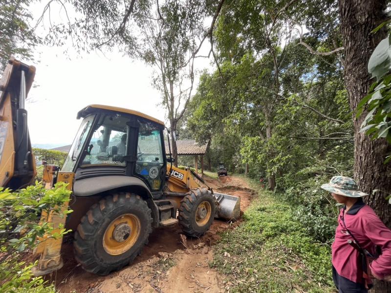 ทีมงานป้องกันฯ ด้รับมอบหมายหน้าที่จากรองนายกสมชาย ดวงติ๊บ ให้นำรถไถ และรถ JCB ลงพื้นที่ปรับถนน เกลี่ยดิน ทางไปวนอุทยานดอยหัวแม่คำ