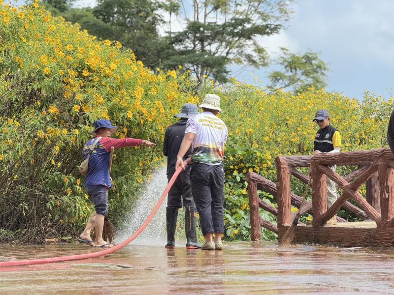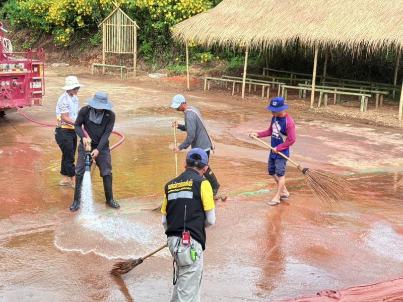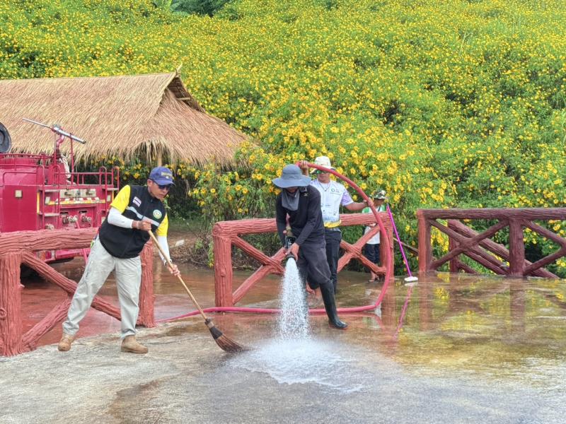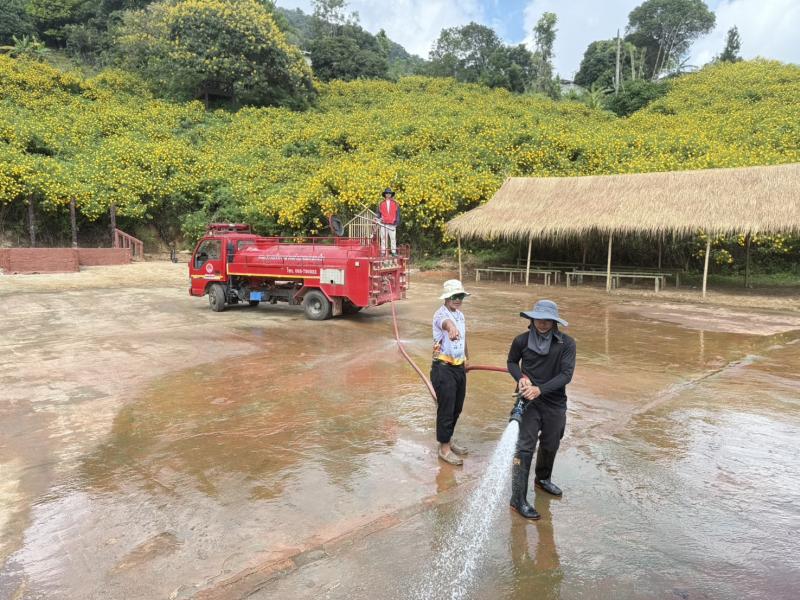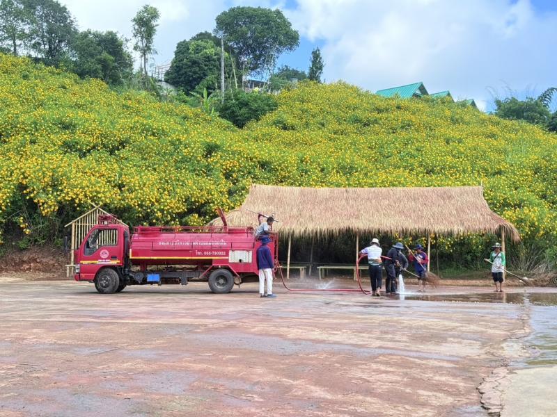 รองนายกสมชาย ดวงติ๊บ พร้อมด้วยงานป้องกันฯ ลงพื้นที่นำรถน้ำล้างทำความสะอาดบริเวณลานบัวตอง