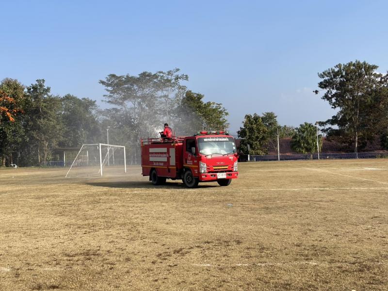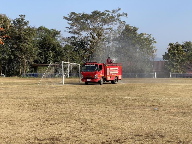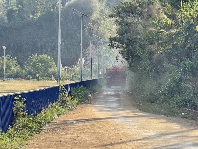 งานป้องกันฯ ออกปฏิบัติภารกิจฉีดพ่นน้ำลดฝุ่นละอองบริเวณบ้านเล่าจาง
