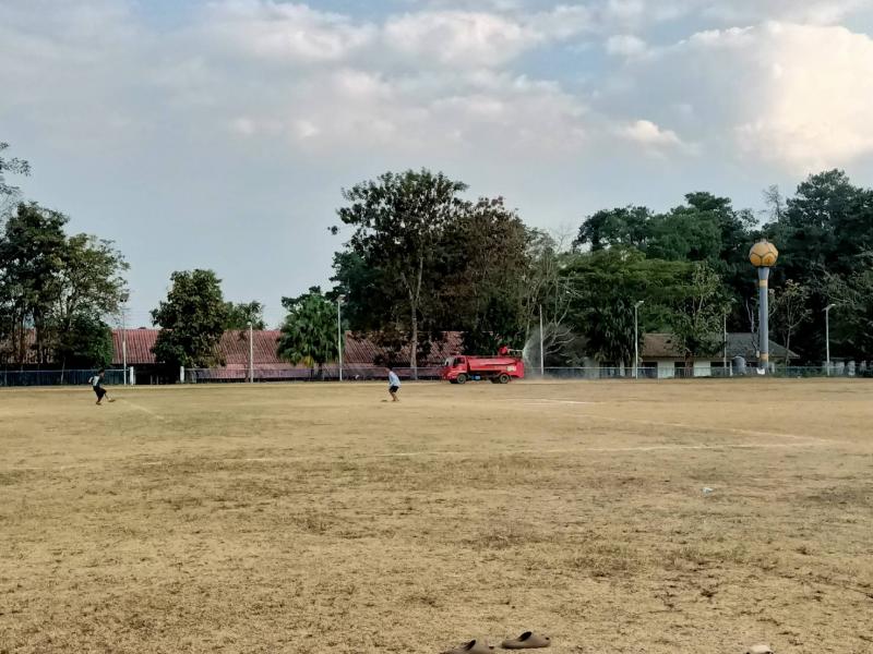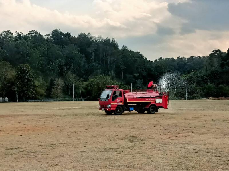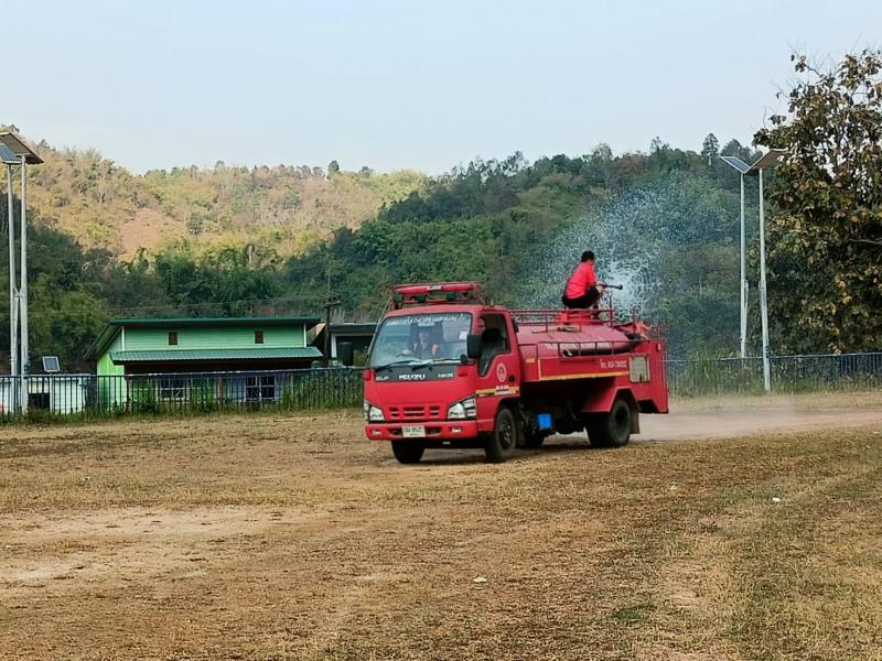 งานป้องกันฯ ได้รับมอบหมายหน้าที่จากรองนายกสมชาย ดวงติ๊บ ให้นำรถบรรทุกน้ำออกพ่นน้ำลดฝุ่น บริเวณสนามกีฬากลางตำบลแม่สลองใน