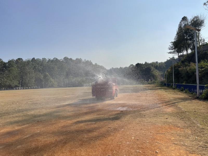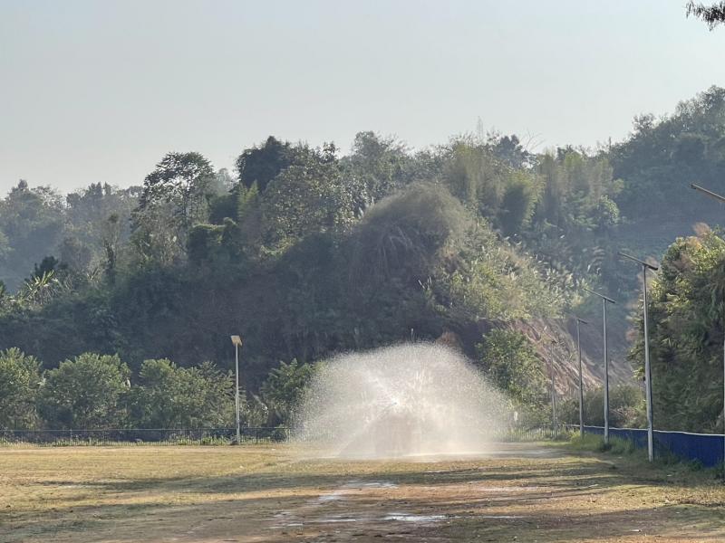 งานป้องกันฯ ออกปฏิบัติภารกิจฉีดพ่นน้ำลดฝุ่นละอองบริเวณสนามกลาง