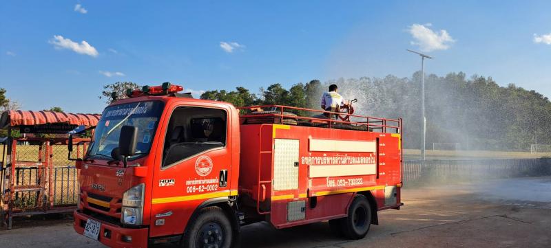 งานป้องกันฯ ออกพ่นละอองน้ำเพื่อลดฝุ่นละอองบริเวณสนามกลาง