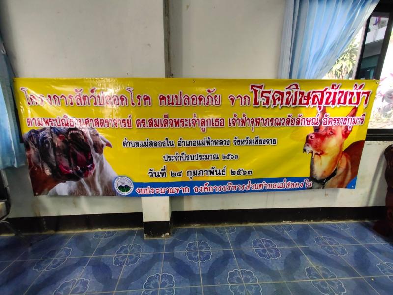 24 กุมภาพันธ์ 2563 งานสาธารณสุข องค์การบริหารส่วนตำบลแม่สลองใน ร่วมกับ ปศุสัตว์อำเภอแม่ฟ้าหลวง อาสาสมัครปศุสัตว์ประจำตำบลแม่สลองใน ดำเนินการฉีดวัคซีนเพื่อป้องกันโรคพิษสุนัขบ้า ตามโครงการ สัตว์ปลอดโรค คนปลอดภัย ตามปณิธานศาสตราจารย์ ดร.สมเด็จพระเจ้าลูกเธอ เจ้าฟ้าจุฬาภรณ์วลัยลักษณ์อัครราชกุมารี ประจำปีงบประมาณ 2563