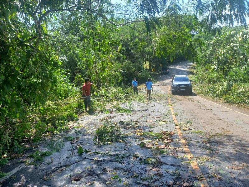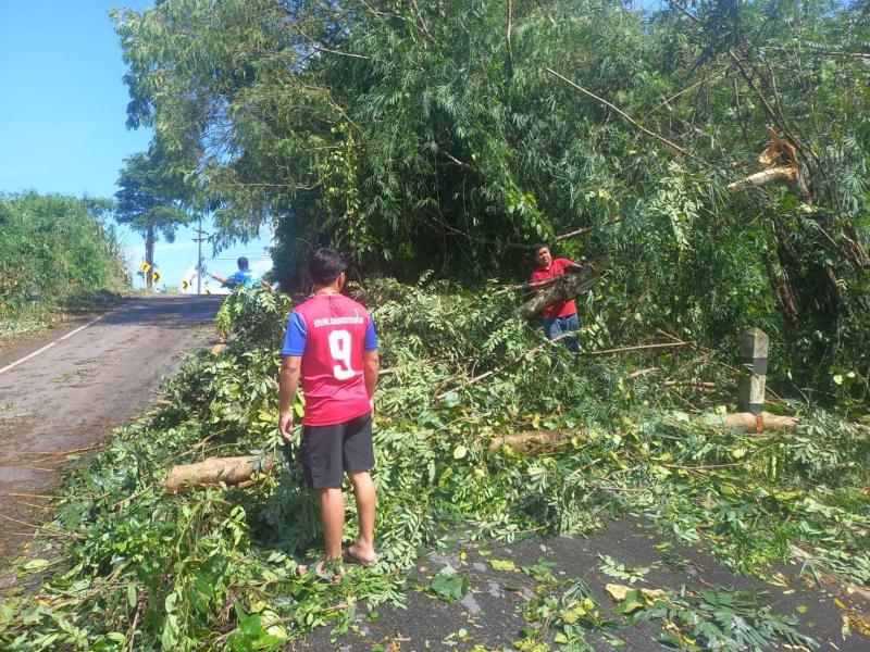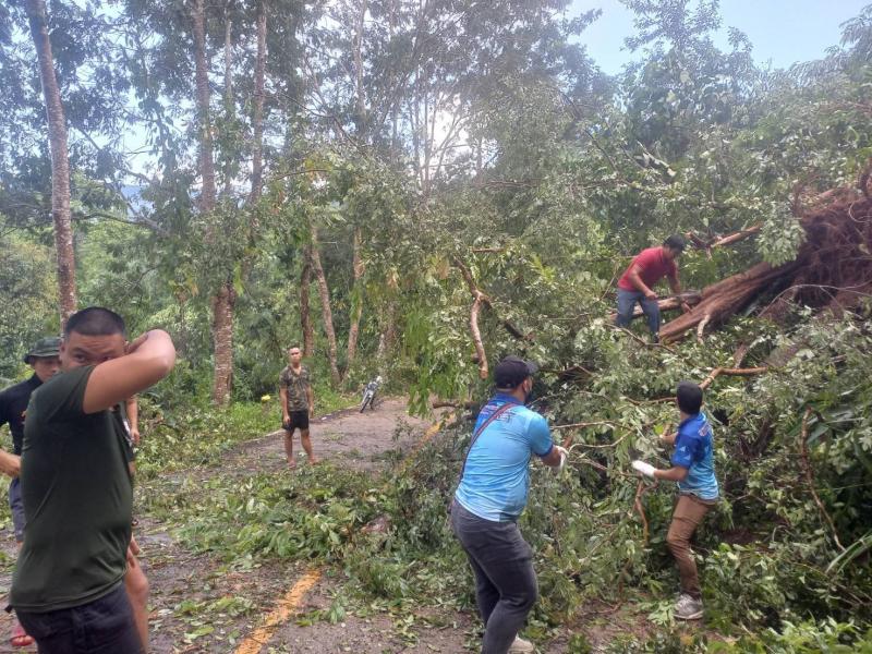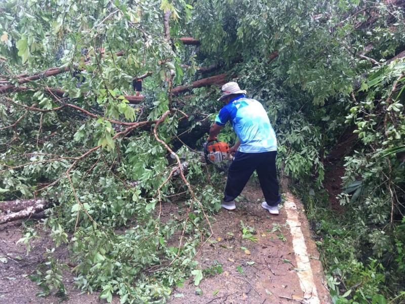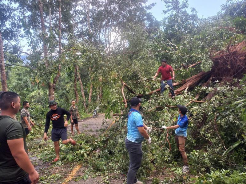 ทีมงานป้องกันและบรรเทาสาธารณภัย องค์การบริหารส่วนตำบลแม่สลองใน ลงพื้นที่ตัดต้นไม้ล้มขวางถนนเหตุเกิดจากพายุฝนตกหนัก บริเวณบ้านห้วยมุและถนนเส้นหลักก่อนถึงบ้านจะคำน้อย