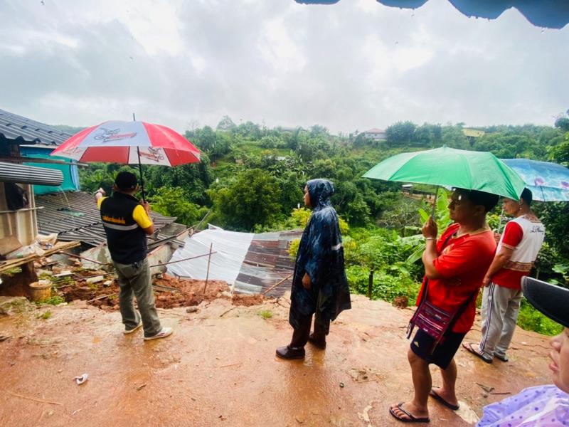 นายสมชาย ดวงติ๊บ รองนายกองค์การบริหารส่วนตำบลแม่สลองในพร้อมด้วยทีมงานป้องกันฯ ผู้ใหญ่บ้าน และสมาชิกอบต. ลงพื้นที่สำรวจความเสียหายบ้านที่เกิดเหตุอุทกภัยดินสไลด์ ณ บ้านหินคำ