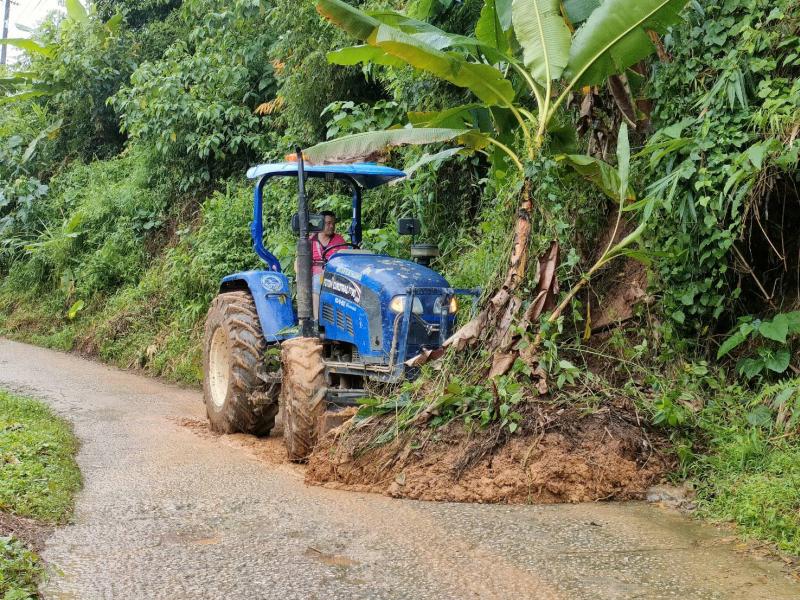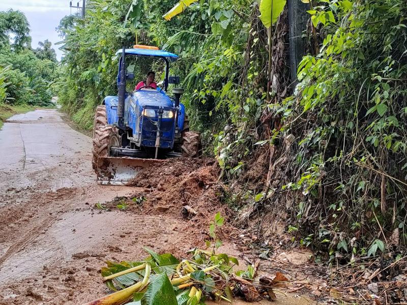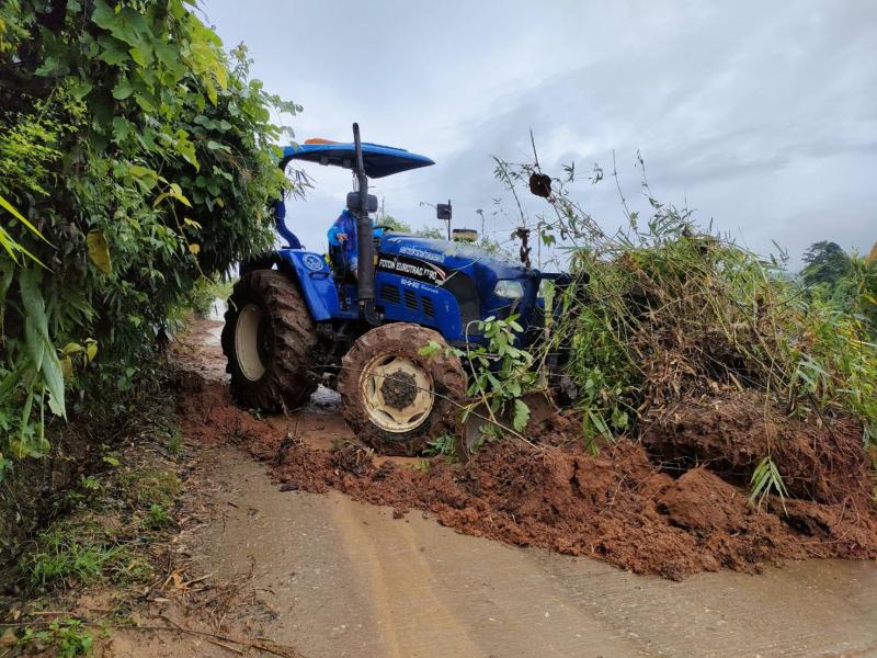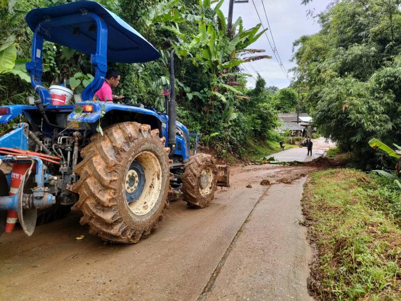 ทีมงานป้องกันและบรรเทาสาธารณภัยองค์การบริหารส่วนตำบลแม่สลองใน พร้อมด้วยเจ้าหน้าที่และรถไถ ออกพื้นที่เพื่อปรับดินสไลด์บริเวณบ้านเล่าลิ่ว