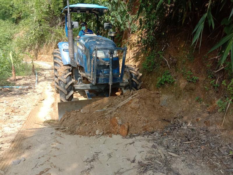 ทีมงานป้องกันฯ นำรถไถออกปรับถนน เนื่องจากดินสไลด์ลงขวางถนนทางเข้าหมู่บ้านมะหินกอง หมู่ที่ 11