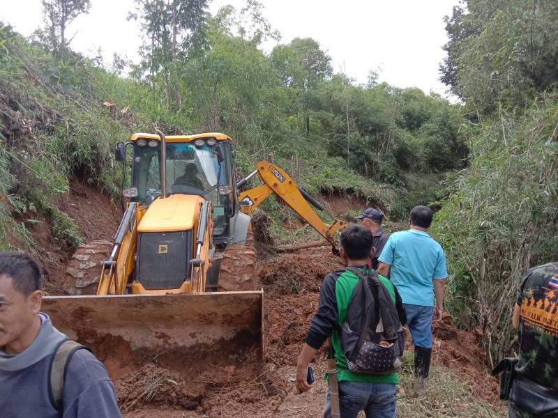 ทีมงานป้องกันฯ นำรถตักหน้าขุดหลังลงพื้นที่บริเวณบ้านห้วยหยวกป่าโซ เนื่องจากฝนตกหนักทำให้ต้นไม้และดินไหลลงมาทับถนน