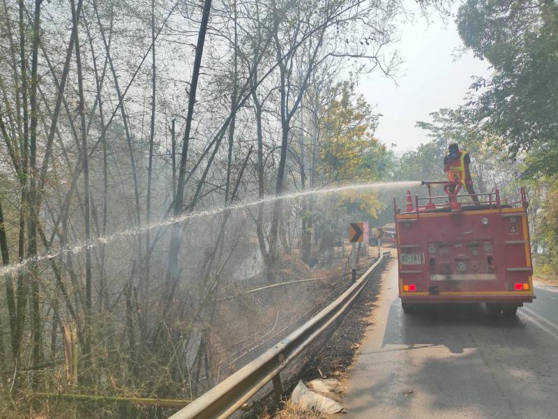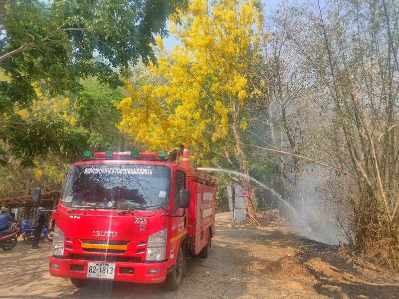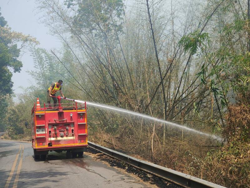 ทีมงานป้องกันออกปฏิบัติภารกิจควบคุมไฟไหม้บริเวณบ้านผาเดื่อ