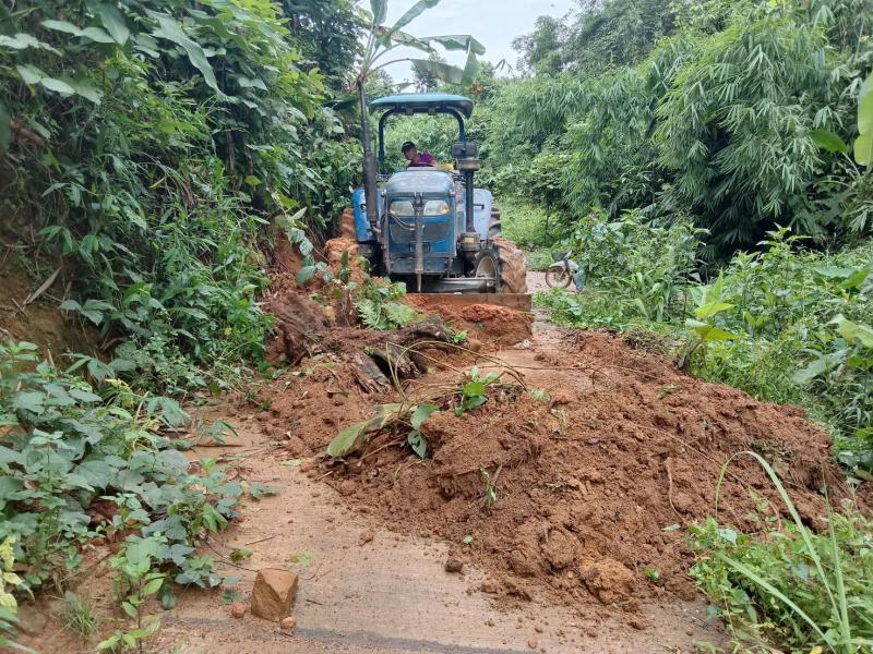 ทีมงานป้ิองกันฯ นำรถไถลงพี้นที่ปรับดินสไลด์ทับถนนบ้านจะคำน้อย (หมู่ที่ 16)