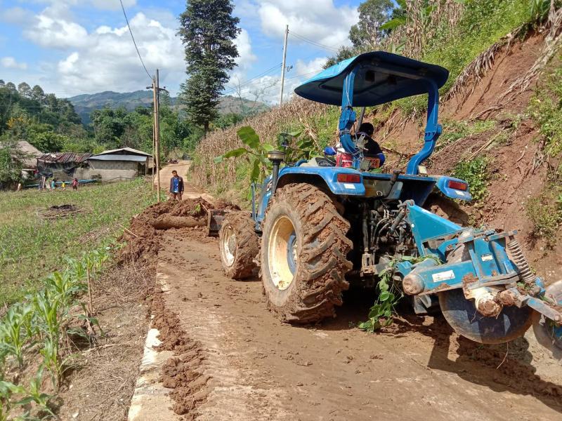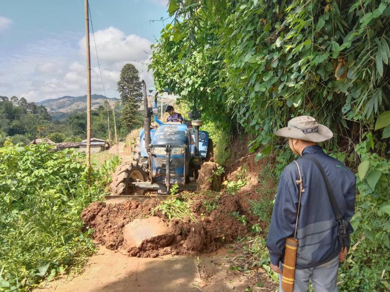 งานป้องกันฯ ออกปฏิบัติงานนำรถไถลงพื้นที่ (ม.14 ) บ้านเล่าลิ่ว เพื่อปรับดินสไลด์ทับถนน