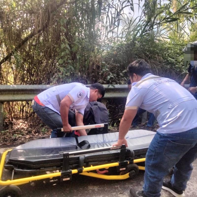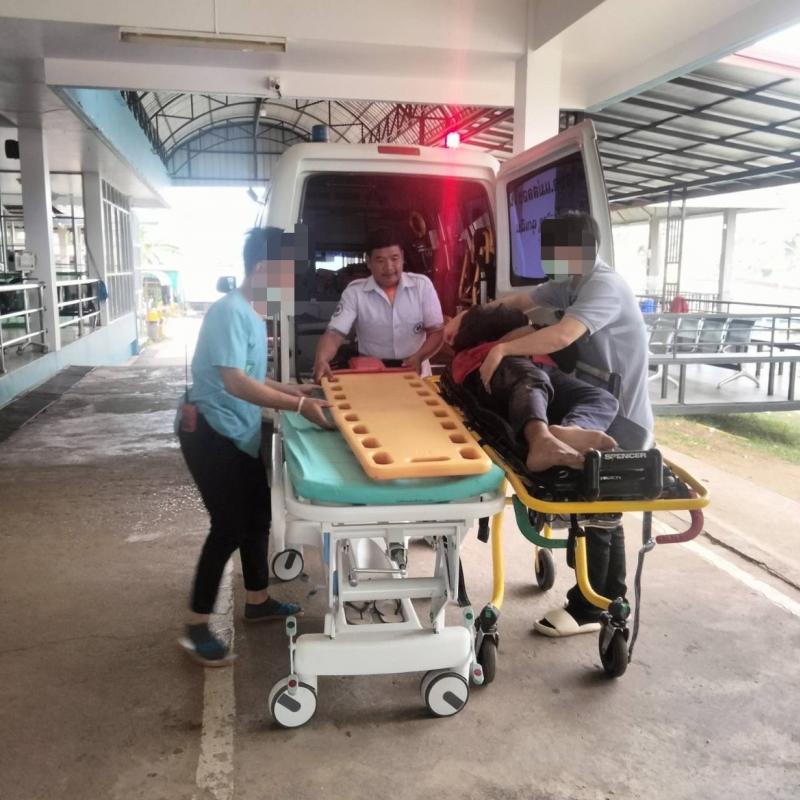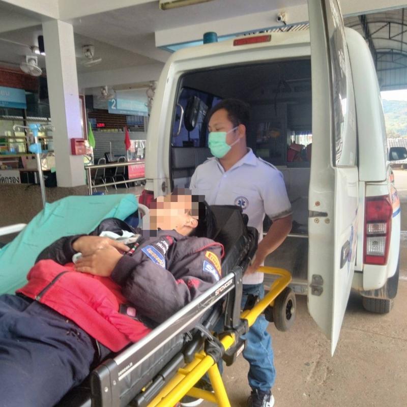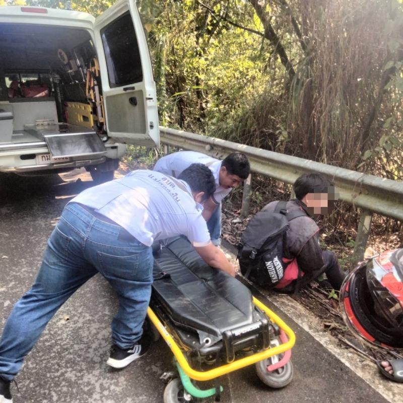ทีมงานกู้ชีพ ออกรับผู้รับบาดเจ็บจักรยานยนต์ล้มบ้านแสนใจ
