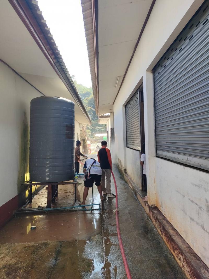 ทีมงานป้องกัน ล้างทำความสะอาดบริเวณทางเดินและห้องน้ำข้างห้องประชุม บ้านห้วยมุ (หมู่ที่ 5)