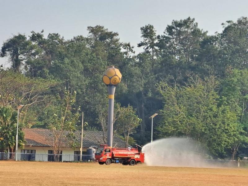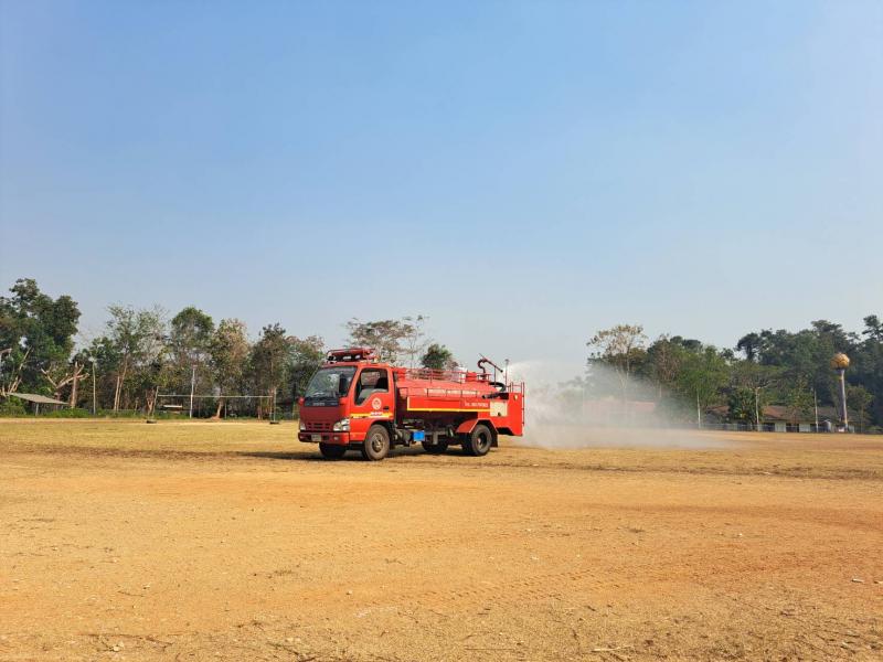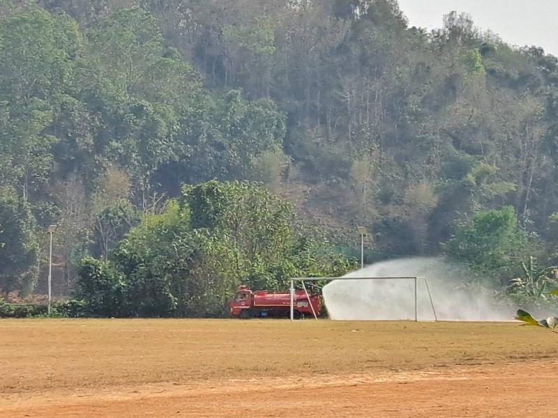 งานป้องกัน ออกปฏิบัติหน้าที่ รดน้ำที่สนามกีฬากลางตำบลแม่สลองใน เพื่อลดฝุ่นpm 2.5 และหมอกควัน