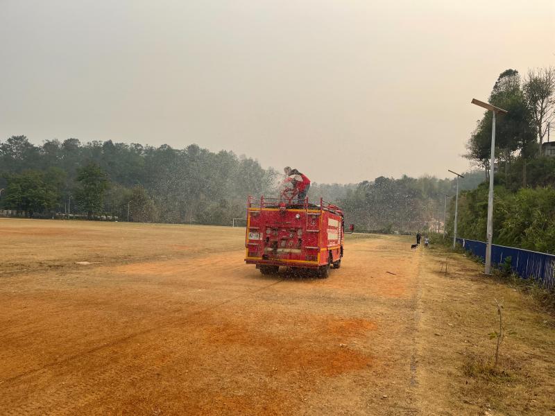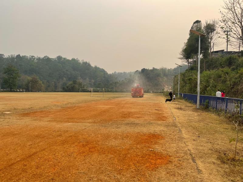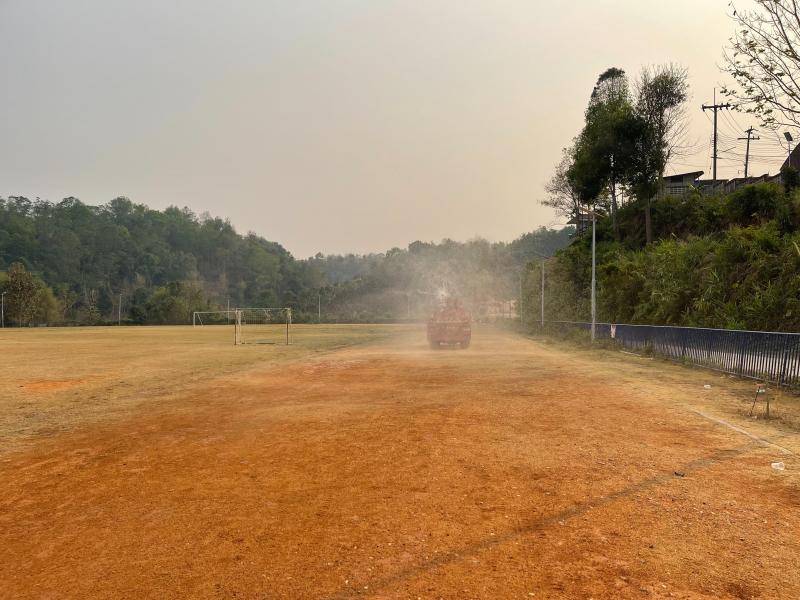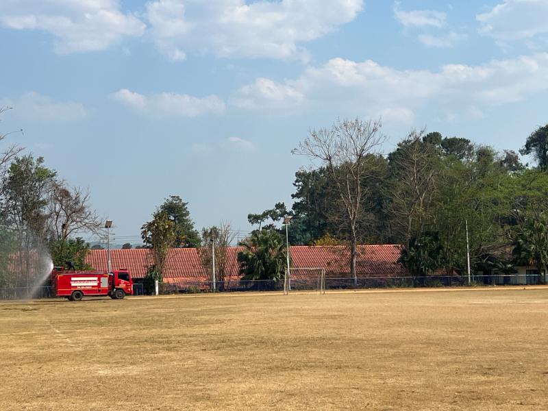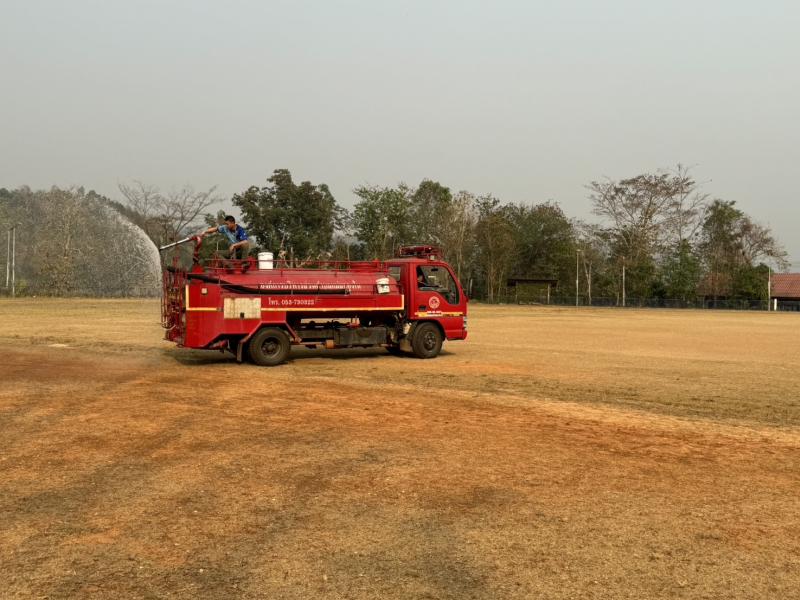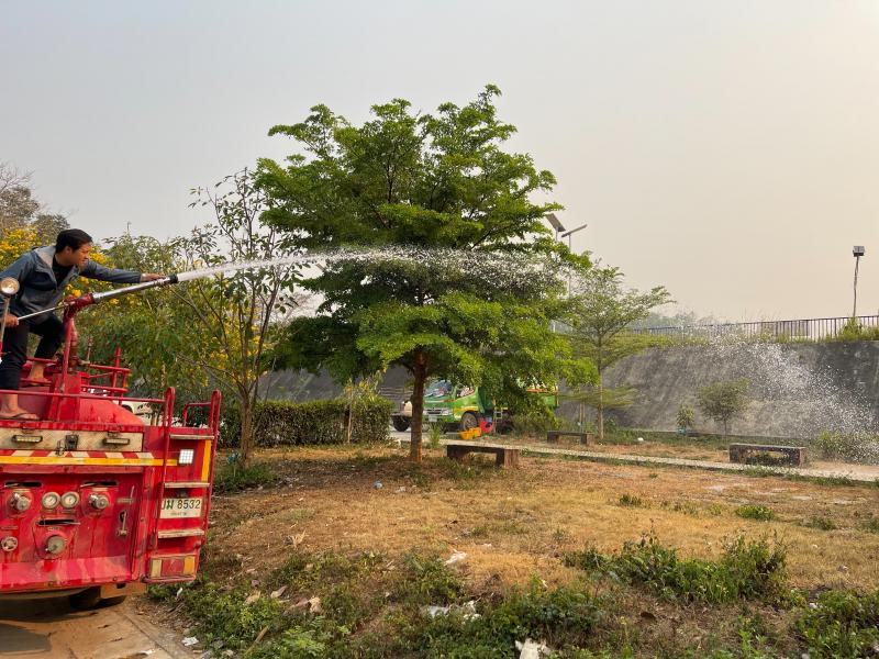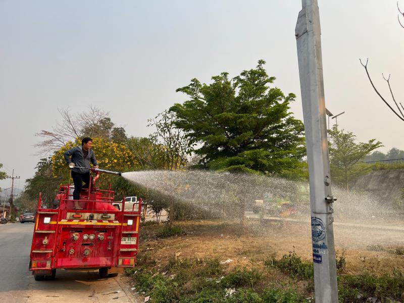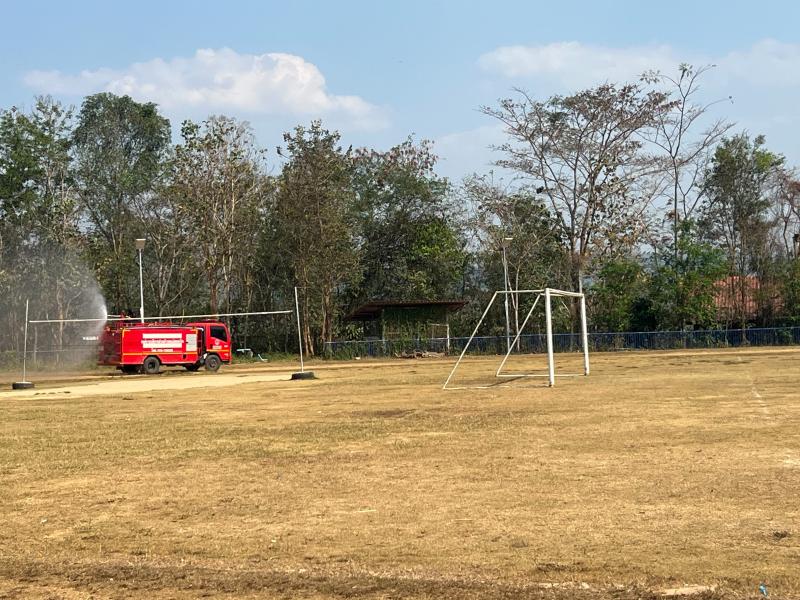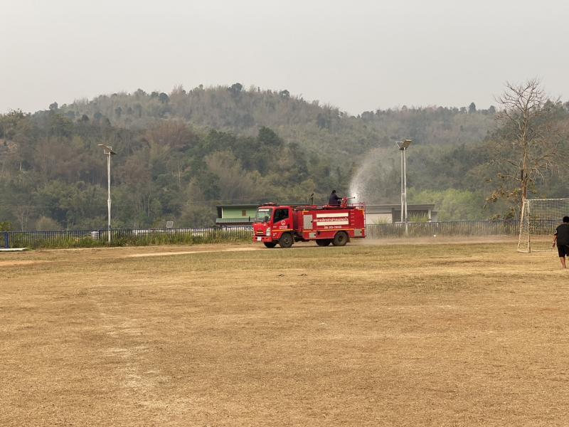 งานป้องกันฯ ออกปฏิบัติหน้าที่ รดน้ำที่สนามกีฬากลางตำบลแม่สลองใน และรดน้ำสวนหย่อมเฉลิมพระเกียรติ เพื่อลดฝุ่น pm 2.5 และหมอกควัน