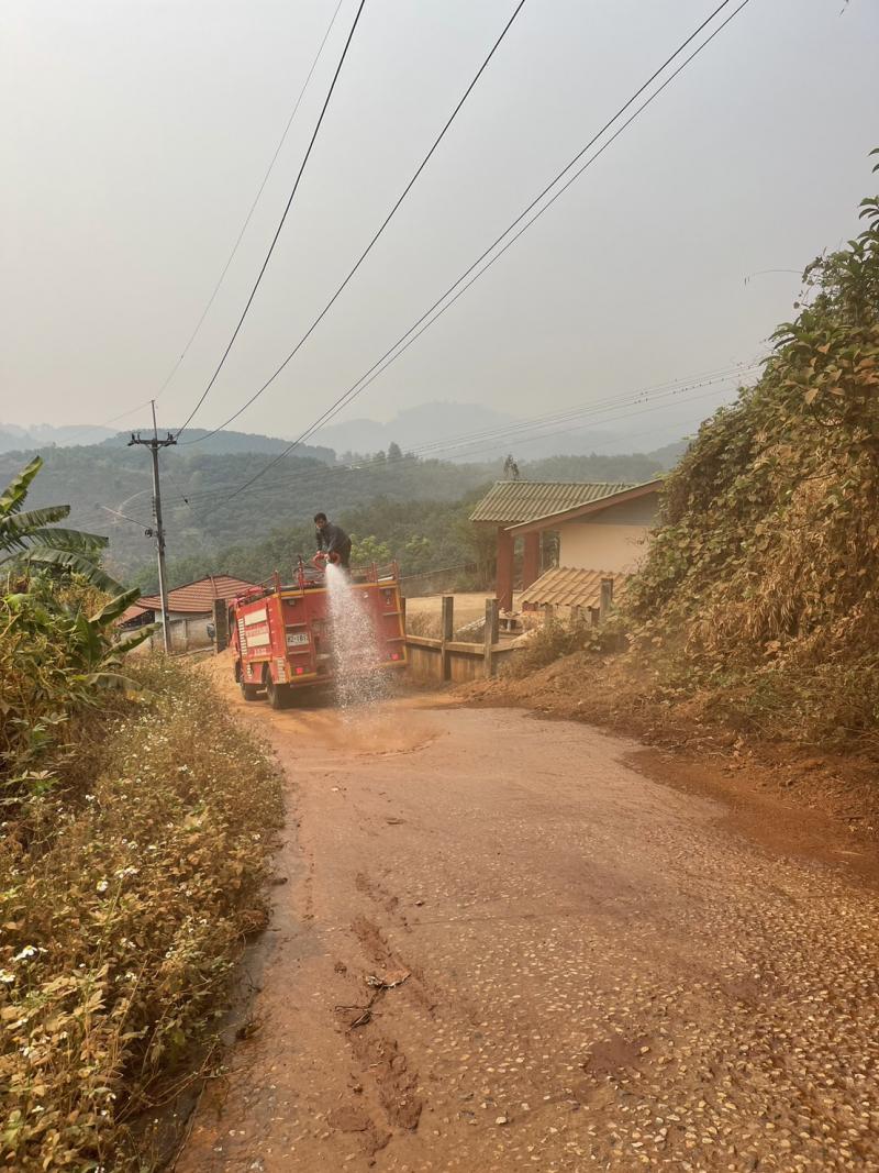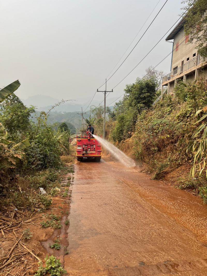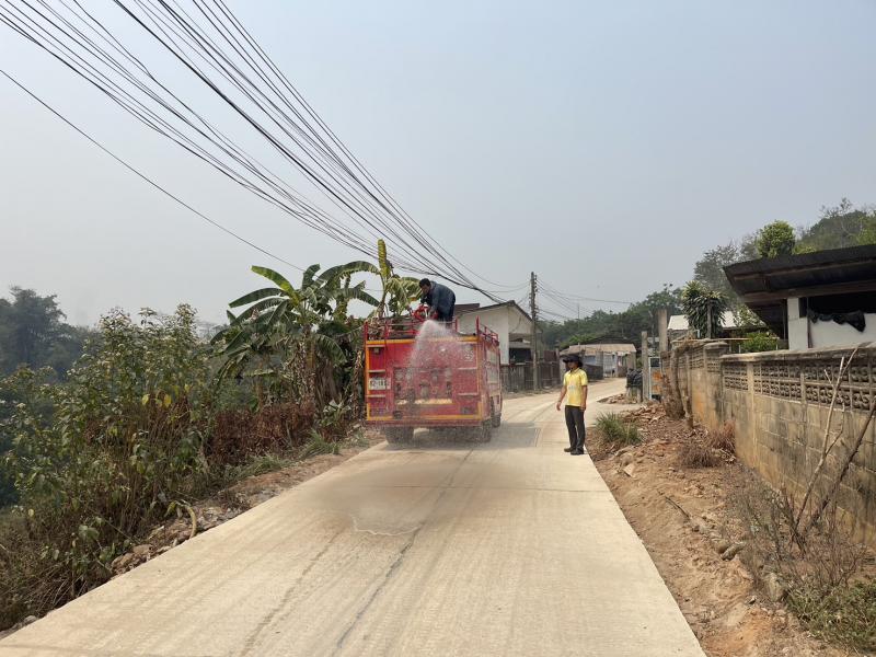 งานป้องกันฯ ออกบริการการล้างทำความสะอาดถนนสร้างใหม่ เพื่อลดอุบัติเหตุ จากเศษหิน ดิน และทราย บ้านหินคำ (ม.27) และบ้านห้วยผึ้ง (ม. 2)