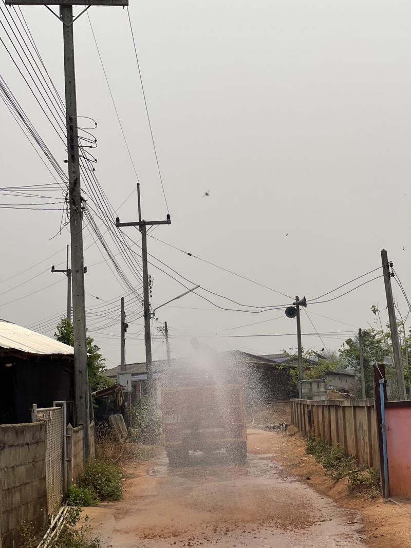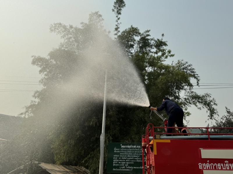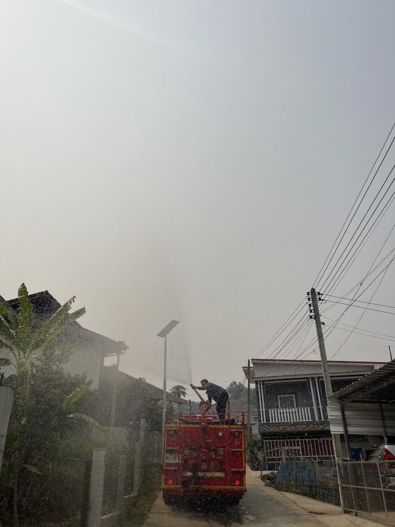 งานป้องกันฯดำเนินการพ่นละอองน้ำในอากาศ ปริมาณ 4,500 ลิตร เพื่อเพิ่มความชื้นในอากาศ และลดฝุ่นละอองขนาดเล็ก PM 2.5 ในพื้นที่