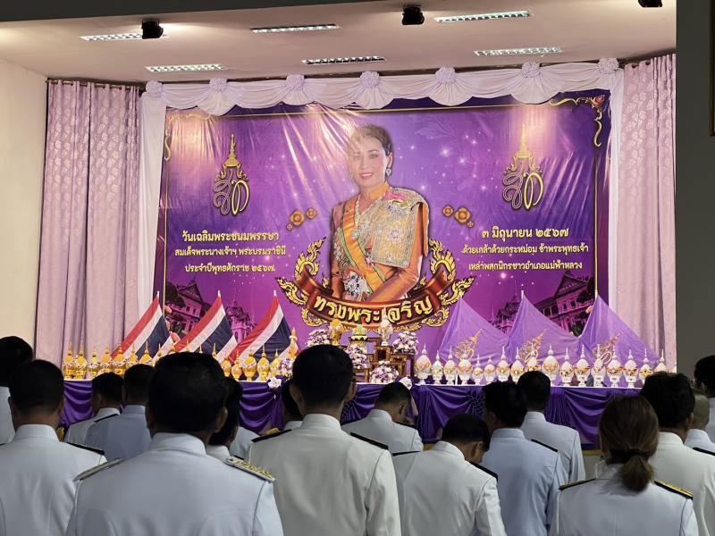 ร่วมงานวันเฉลิมพระชนมพรรษา สมเด็จพระนางเจ้าฯ พระบรมราชินี ร่วมพิธีถวายเครื่องราชสักการะและวางพานพุ่ม (พุ่มเงิน - พุ่มทอง) และพิธีจุดเทียนถวายพระพรชัยมงคล ณ หอประชุมอำเภอแม่ฟ้าหลวง