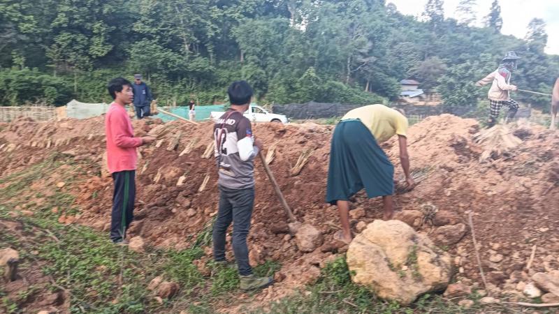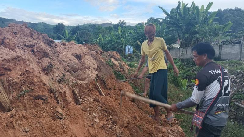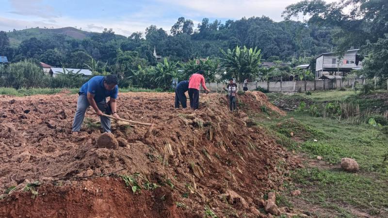 อาสาสมัครท้องถิ่นรักษ์โลก ร่วมกันปลูกหญ้าแฝกที่บริเวณหอประชุมบ้านนาโต่