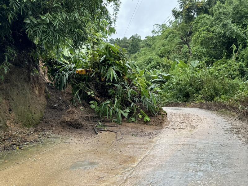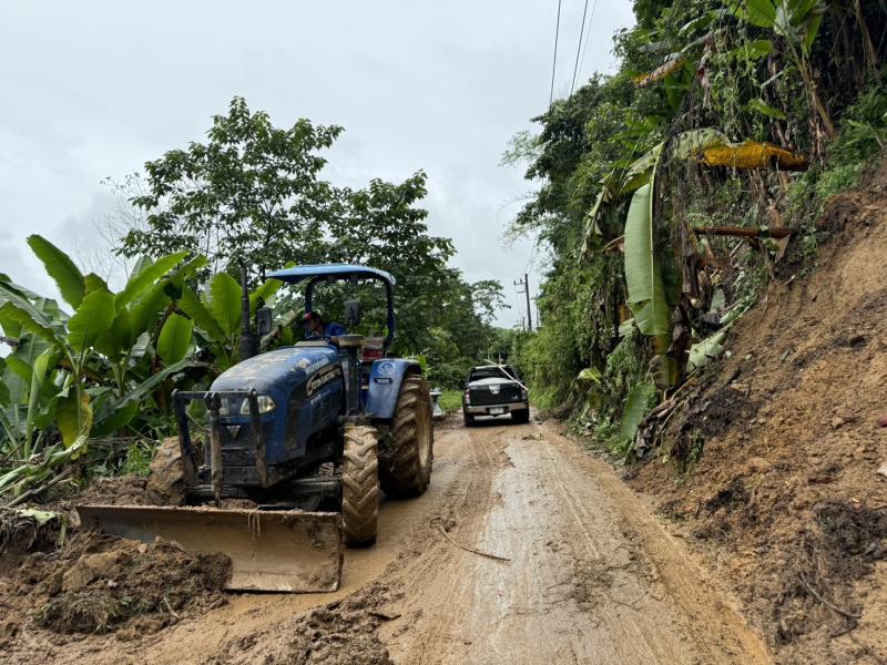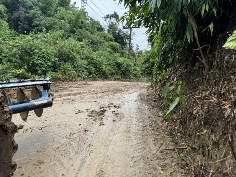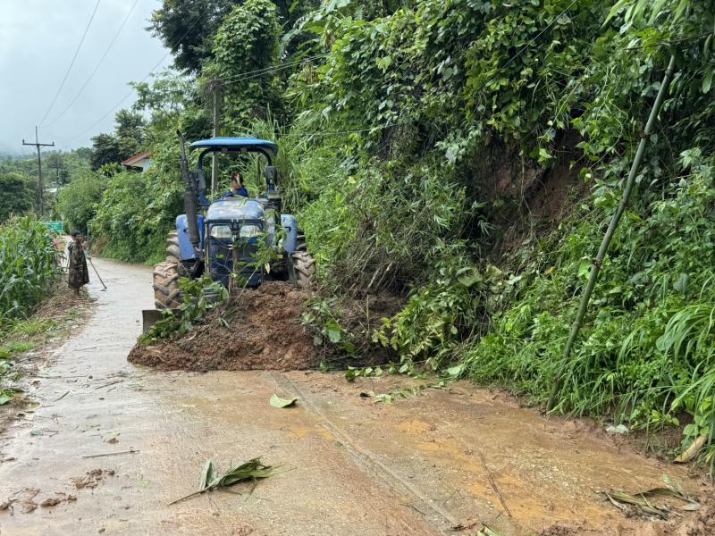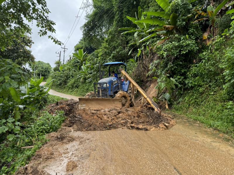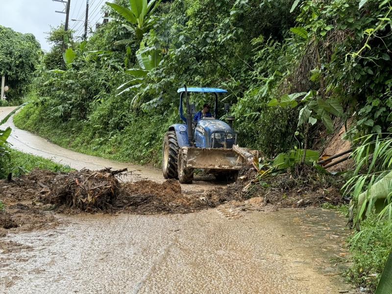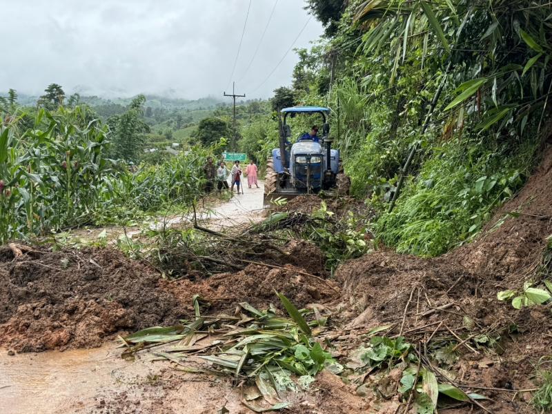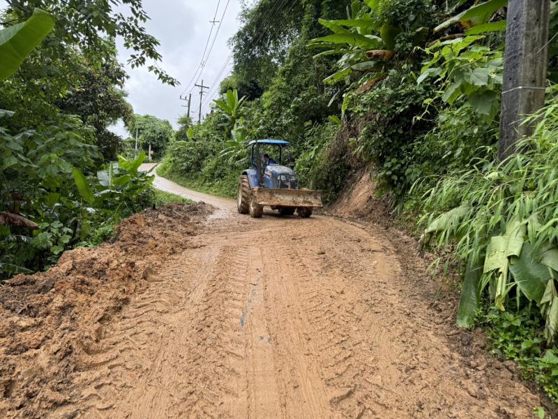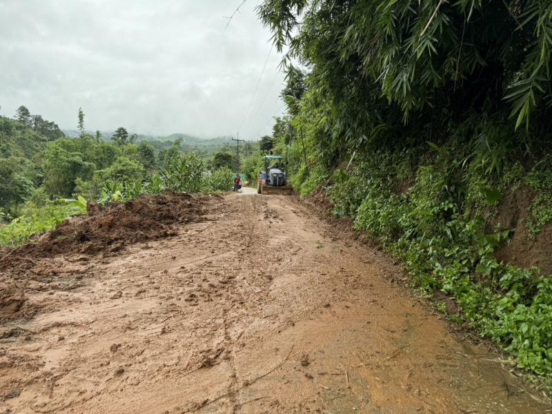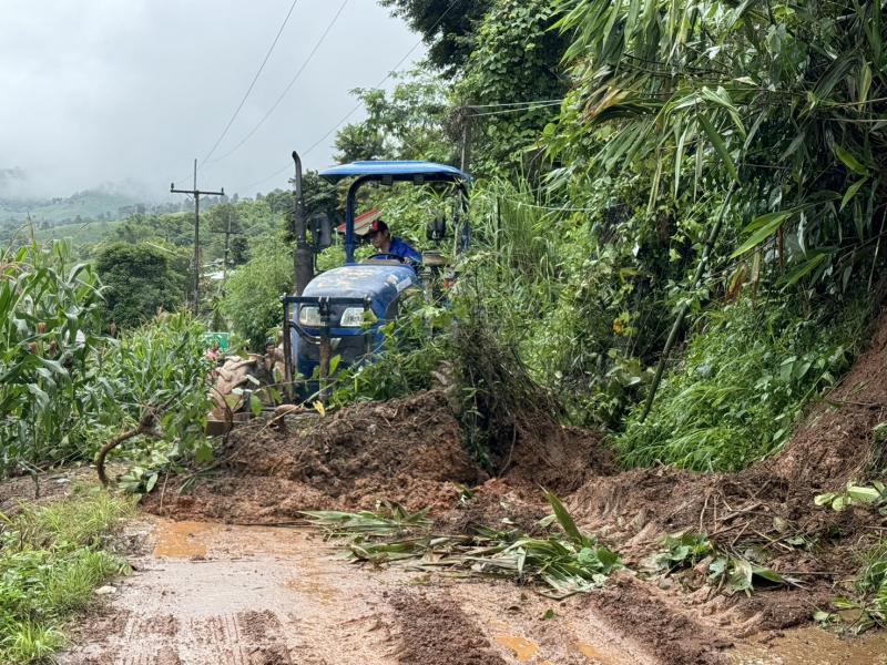 งานป้องกันฯ นำรถไถลงพื้นที่ปรับดินสไลด์ปิดทับถนน บริเวณบ้านห้วยหยวกป่าโซและบ้านเล่าลิ่ว จำนวน 3 จุด