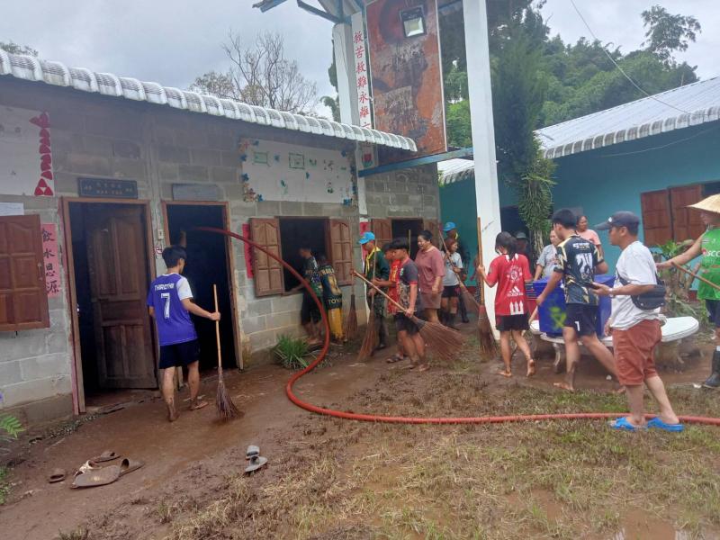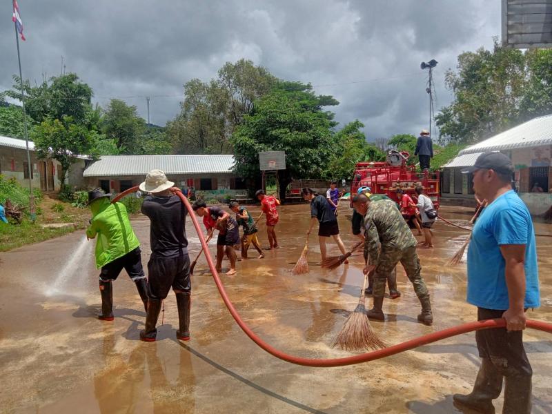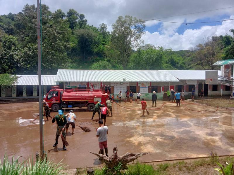 ทีมงานป้องกันฯ นำรถบรรทุกน้ำออกทำความสะอาดล้างดินโคลน จากเหตุอุทกภัย โรงเรียนจีนบ้านเล่าลิ่ว