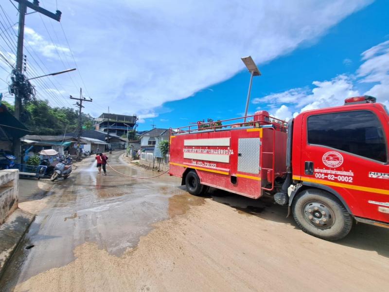 วันนี้ 29 กันยายน 2567 งานป้องกันและบรรเทาสาธารณภัย อบต.แม่สลองใน นำรถบรรทุกน้ำ ลงพื้นที่ล้างทำความสะอาดพื้นที่ได้รับความเสียหาย จากเหตุการณ์น้ำท่วม บริเวณตลาดไททอง (ม.12) และถนน
