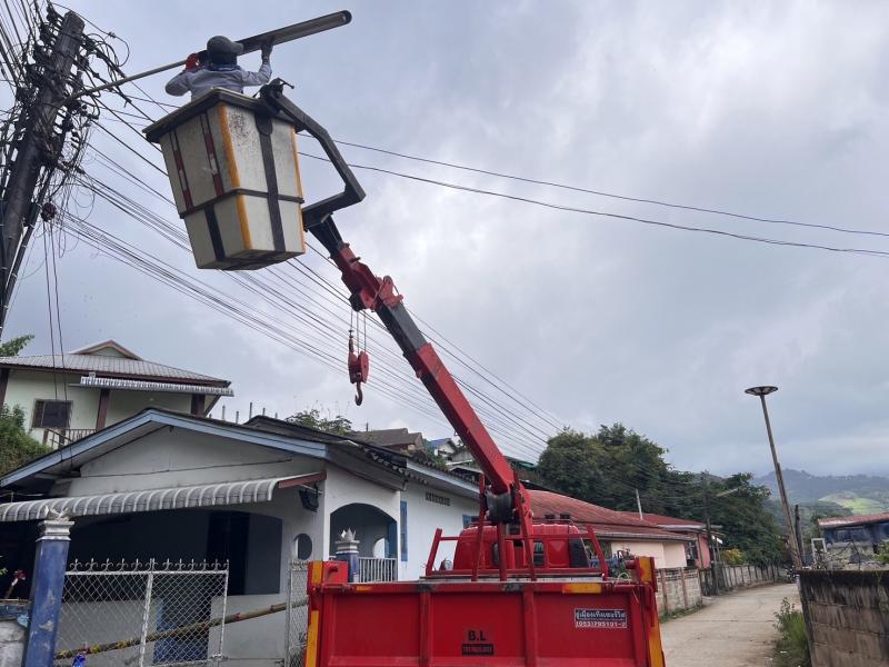 งานกองช่าง ออกปฏิบัติหน้าที่ ซ่อมแซมโคมไฟกิ่งสาธารณะ ณ บ้านหินแตก