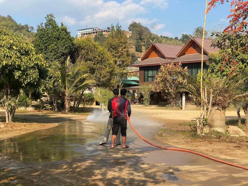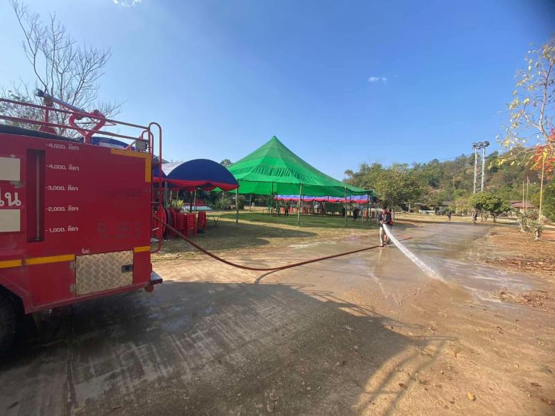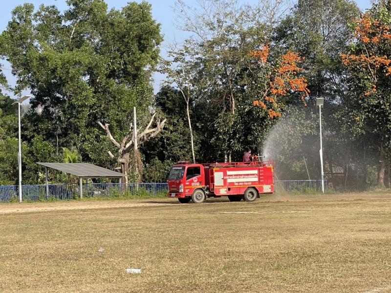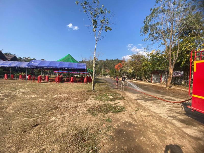 งานป้องกันฯ ออกปฏิบัติภารกิจฉีดพ่นน้ำลดฝุ่นละอองบริเวณบ้านเล่าจาง