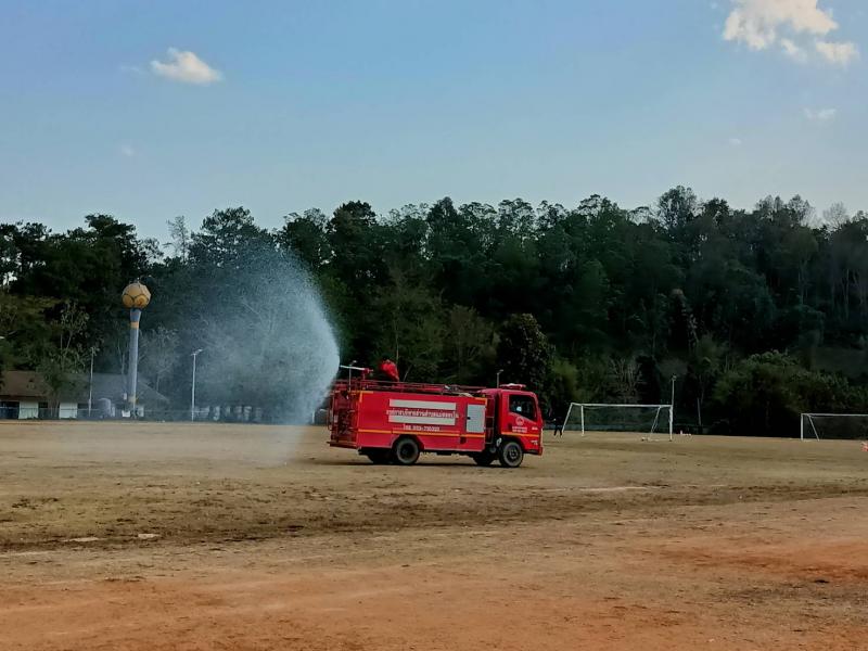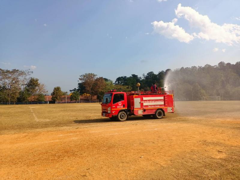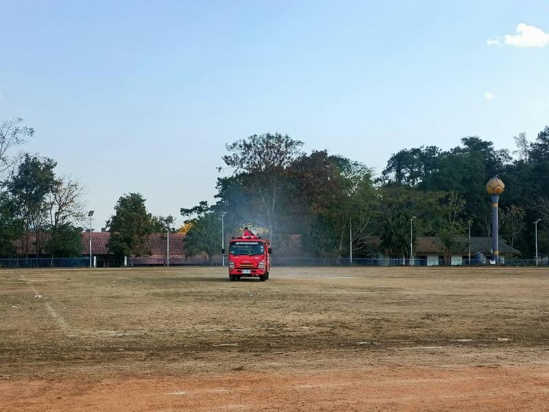 งานป้องกันฯ ออกปฏิบัติภารกิจฉีดพ่นน้ำลดฝุ่นละอองบริเวณสนามกลาง