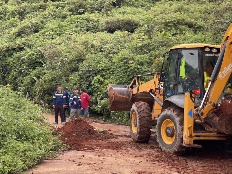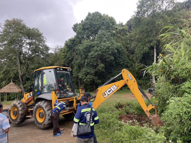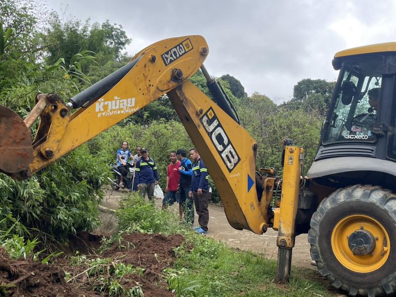 ทีมงานป้องกันฯ ได้รับมอบหมายหน้าที่จากรองนายกสมชาย ดวงติ๊บ ให้นำรถ JCB ลงพื้นที่ขุดร่องระบายน้ำและปรับถนน