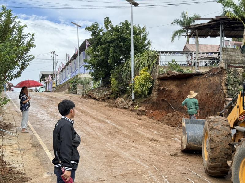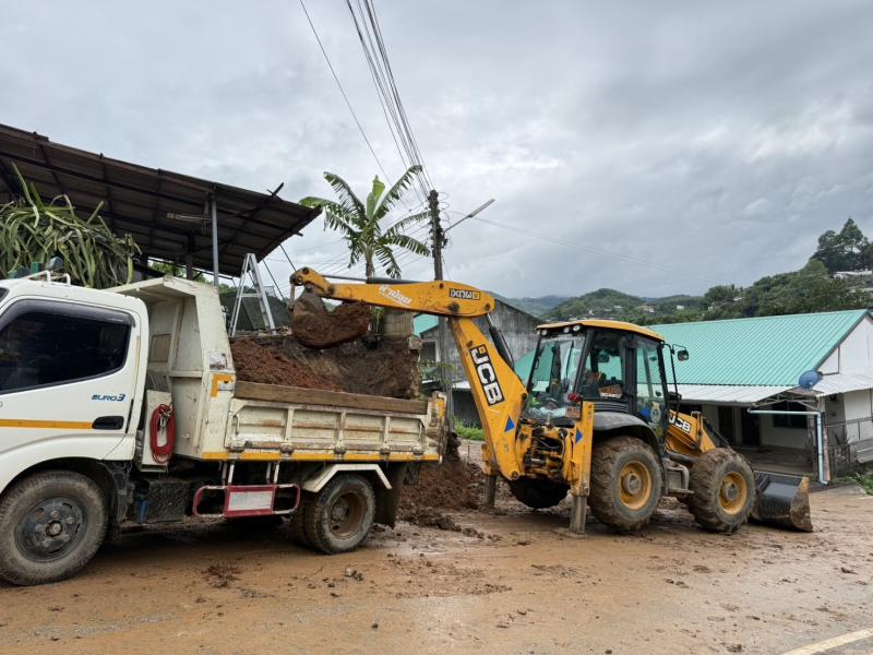 ทีมงานป้องกันฯ ได้รับมอบหมายภารกิจจากรองนายกสมชาย ดวงติ๊บ ให้นำรถ JCB ขุดดินสไลด์ บริเวณหมู่ที่ 1 บ้านหินแตก