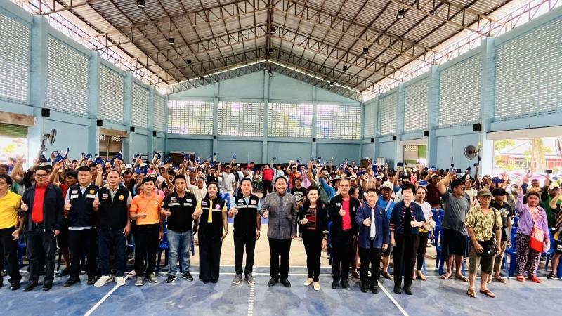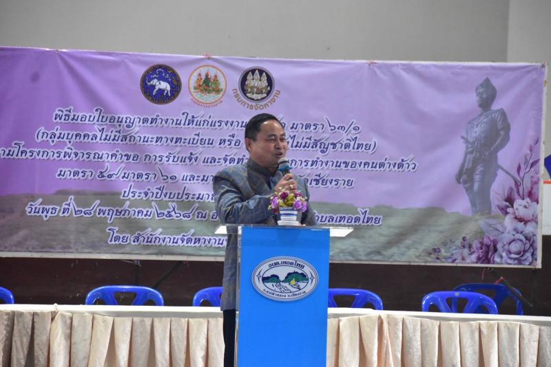ร่วมมอบใบอนุญาตทำงานให้แก่แรงงานต่างด้าว มาตรา ๖๓/๑ (กลุ่มบุคคลไม่มีสถานะทางทะเบียน หรือ บุคคลซึ่งไม่มีสัญชาติไทย) ณ หอประชุมหมู่บ้านเทอดไทย