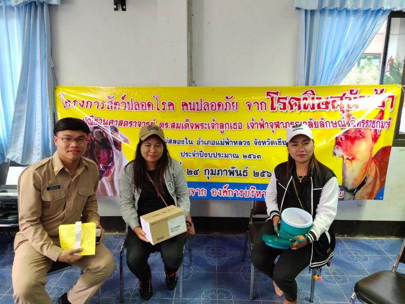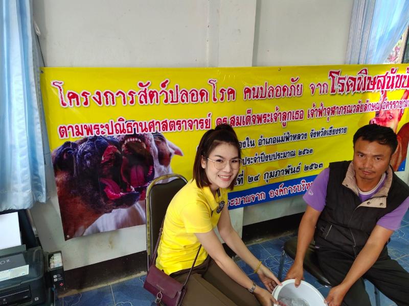 24 กุมภาพันธ์ 2563 งานสาธารณสุข องค์การบริหารส่วนตำบลแม่สลองใน ร่วมกับ ปศุสัตว์อำเภอแม่ฟ้าหลวง อาสาสมัครปศุสัตว์ประจำตำบลแม่สลองใน ดำเนินการฉีดวัคซีนเพื่อป้องกันโรคพิษสุนัขบ้า ตามโครงการ สัตว์ปลอดโรค คนปลอดภัย ตามปณิธานศาสตราจารย์ ดร.สมเด็จพระเจ้าลูกเธอ เจ้าฟ้าจุฬาภรณ์วลัยลักษณ์อัครราชกุมารี ประจำปีงบประมาณ 2563