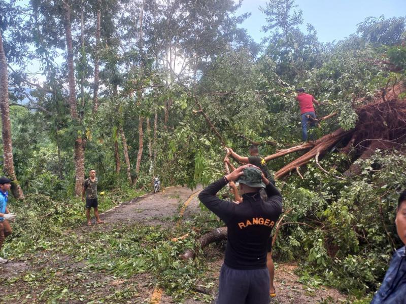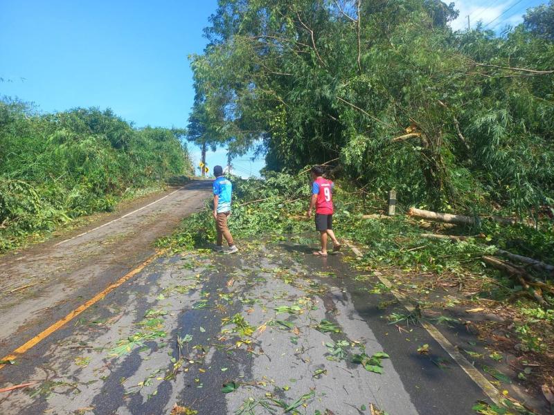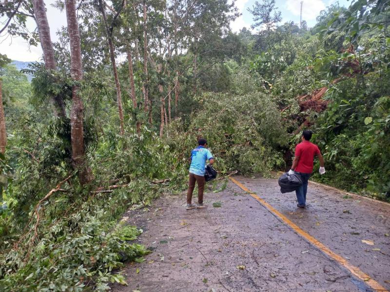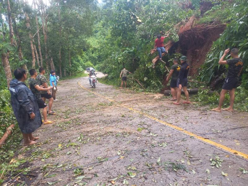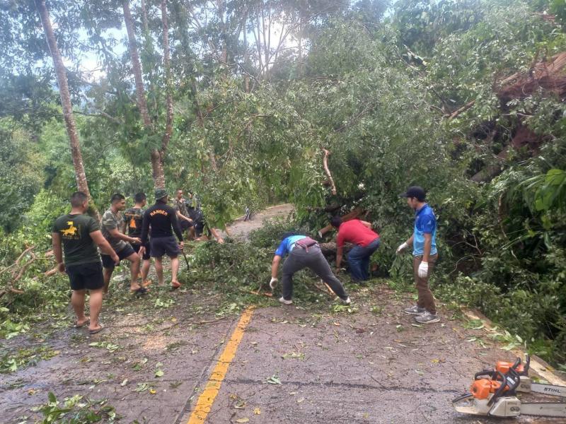 ทีมงานป้องกันและบรรเทาสาธารณภัย องค์การบริหารส่วนตำบลแม่สลองใน ลงพื้นที่ตัดต้นไม้ล้มขวางถนนเหตุเกิดจากพายุฝนตกหนัก บริเวณบ้านห้วยมุและถนนเส้นหลักก่อนถึงบ้านจะคำน้อย