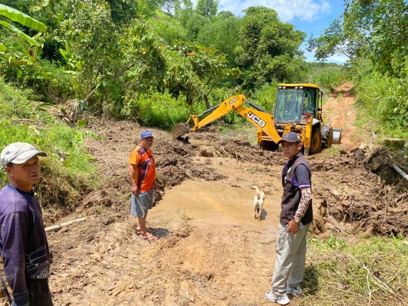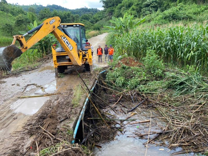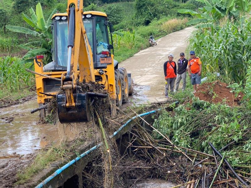 นายสมชาย ดวงติ๊บ รองนายกองค์การบริหารส่วนตำบลแม่สลองใน พร้อมด้วยทีมงานป้องกันและบรรเทาสาธารณภัย อบต.แม่สลองใน นำรถ jcb ออกพื้นที่ดึงไม้ไผ่ติดสะพานข้ามน้ำ หมู่ที่ 21 บ้านโป่งไฮ