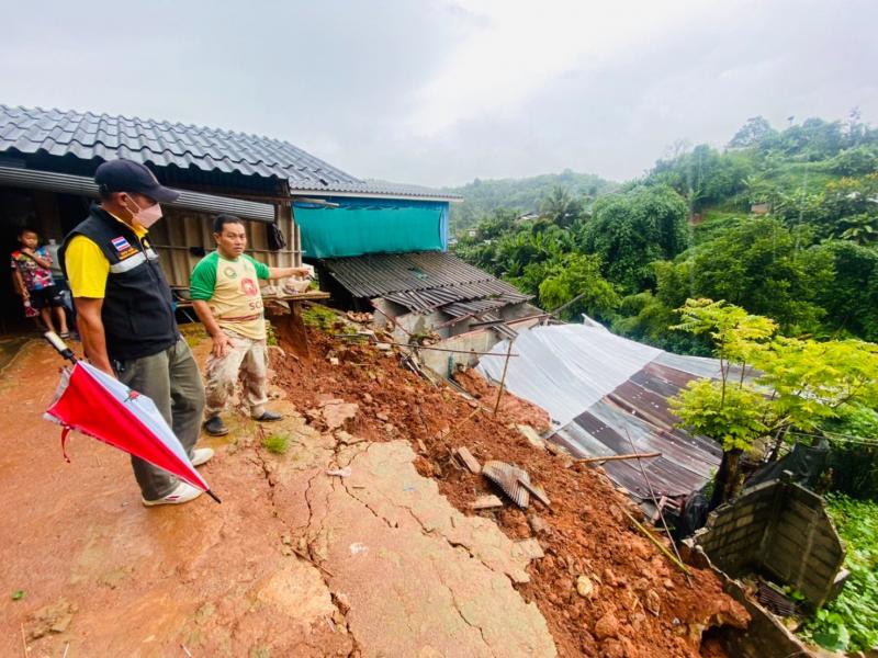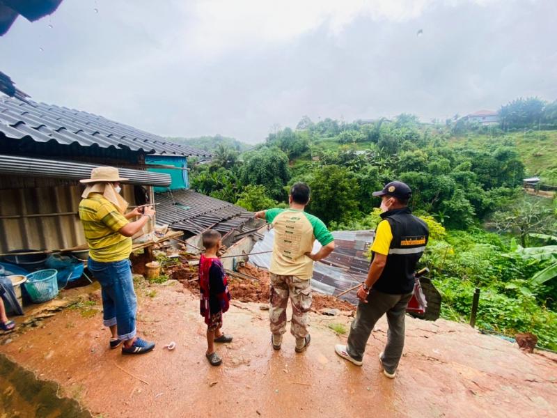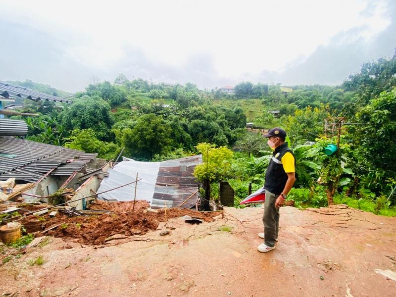 นายสมชาย ดวงติ๊บ รองนายกองค์การบริหารส่วนตำบลแม่สลองในพร้อมด้วยทีมงานป้องกันฯ ผู้ใหญ่บ้าน และสมาชิกอบต. ลงพื้นที่สำรวจความเสียหายบ้านที่เกิดเหตุอุทกภัยดินสไลด์ ณ บ้านหินคำ