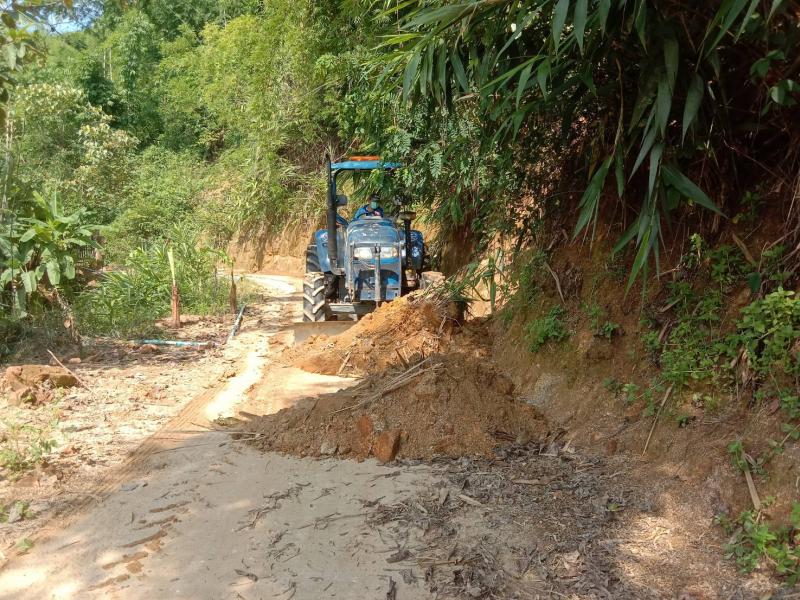 ทีมงานป้องกันฯ นำรถไถออกปรับถนน เนื่องจากดินสไลด์ลงขวางถนนทางเข้าหมู่บ้านมะหินกอง หมู่ที่ 11