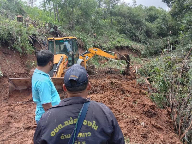 ทีมงานป้องกันฯ นำรถตักหน้าขุดหลังลงพื้นที่บริเวณบ้านห้วยหยวกป่าโซ เนื่องจากฝนตกหนักทำให้ต้นไม้และดินไหลลงมาทับถนน