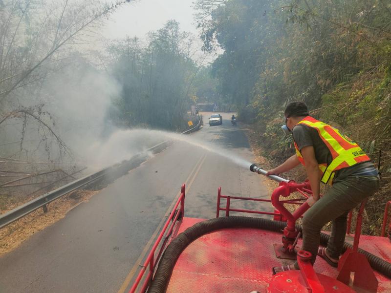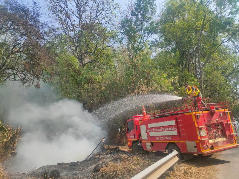 ทีมงานป้องกันออกปฏิบัติภารกิจควบคุมไฟไหม้บริเวณบ้านผาเดื่อ