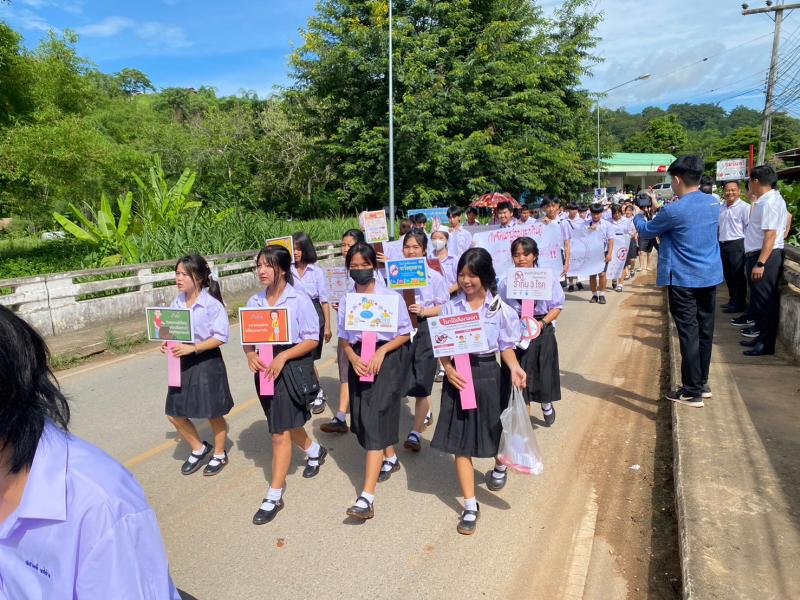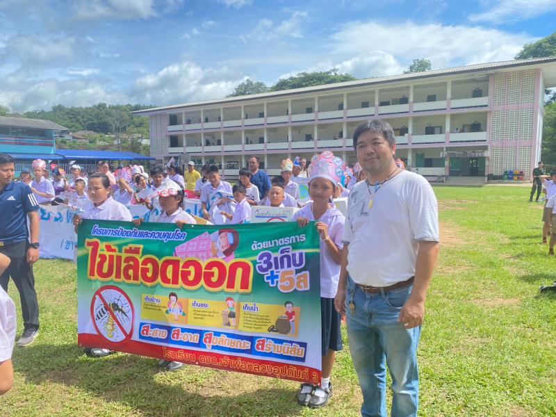 กิจกรรมเดินรณรงค์ประชาสัมพันธ์ป้องกันโรคไข้เลือดออกร่วมกับโรงเรียนบ้านห้วยผึ้ง โรงเรียนเจ้าพ่อหลวงอุปภัมภ์3 (ช่างกลปทุมวัน) ประชาชนหมู่ที่ 1,2,12และ27