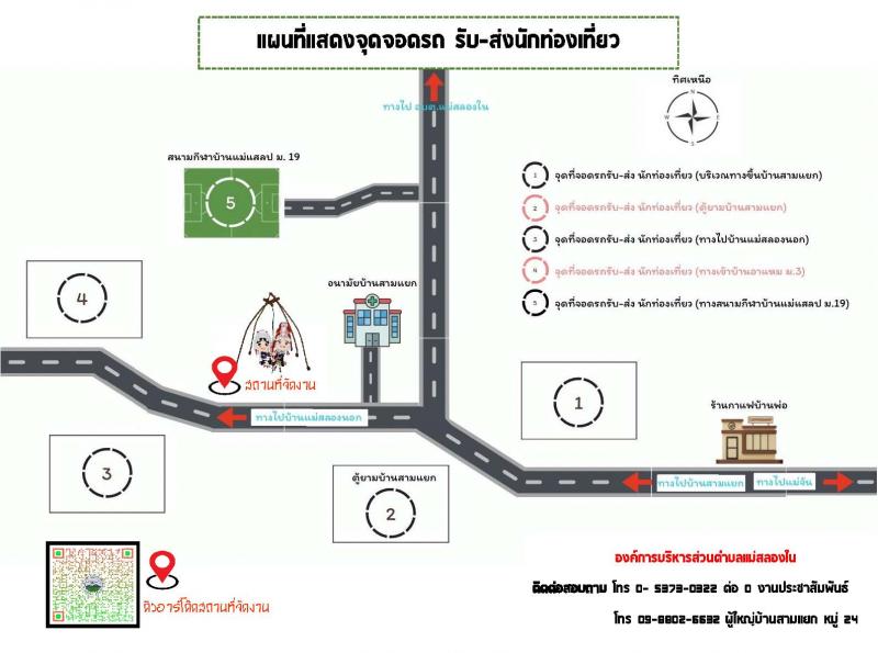 ประชาสัมพันธ์แผนที่แสดงจุดจอดรถ รับ - ส่ง นักท่องเที่ยว งานเทศกาลโล้ชิงช้า " บ่อ ฉ่อง ตุ๊ " ประจำปี 2566 ในวันที่ 9 - 10 กันยายน 2566 ณ ลานพระสยามเทวาธิราช บ้านสามแยกอาข่า อำเภอแม่ฟ้าหลวง จังหวัดเชียงราย