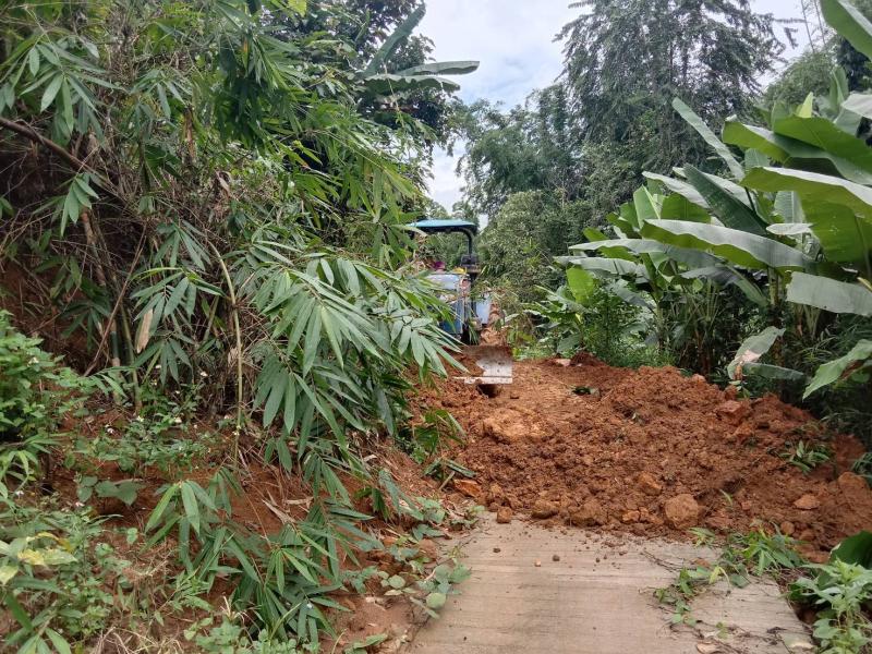 ทีมงานป้ิองกันฯ นำรถไถลงพี้นที่ปรับดินสไลด์ทับถนนบ้านจะคำน้อย (หมู่ที่ 16)