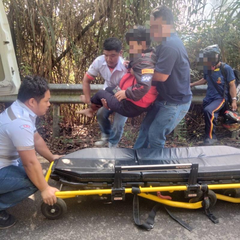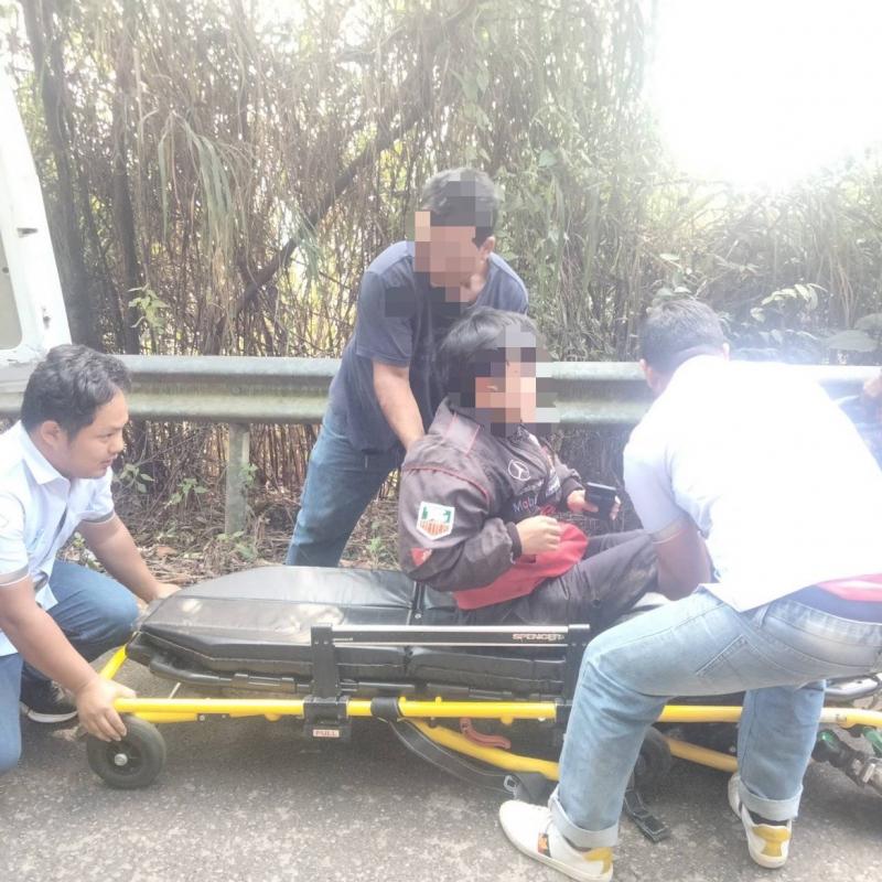 ทีมงานกู้ชีพ ออกรับผู้รับบาดเจ็บจักรยานยนต์ล้มบ้านแสนใจ
