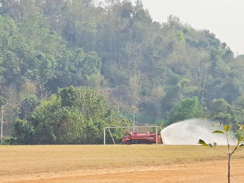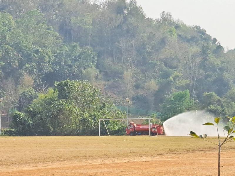 งานป้องกัน ออกปฏิบัติหน้าที่ รดน้ำที่สนามกีฬากลางตำบลแม่สลองใน เพื่อลดฝุ่นpm 2.5 และหมอกควัน